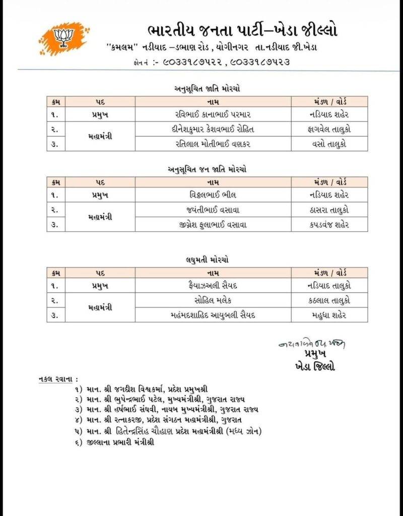ભાજપ ખેડા જિલ્લામાં સંગઠનાત્મક નિમણૂકો જાહેર, વિવિધ મોરચા અને વિભાગોમાં નવી ટીમની રચના