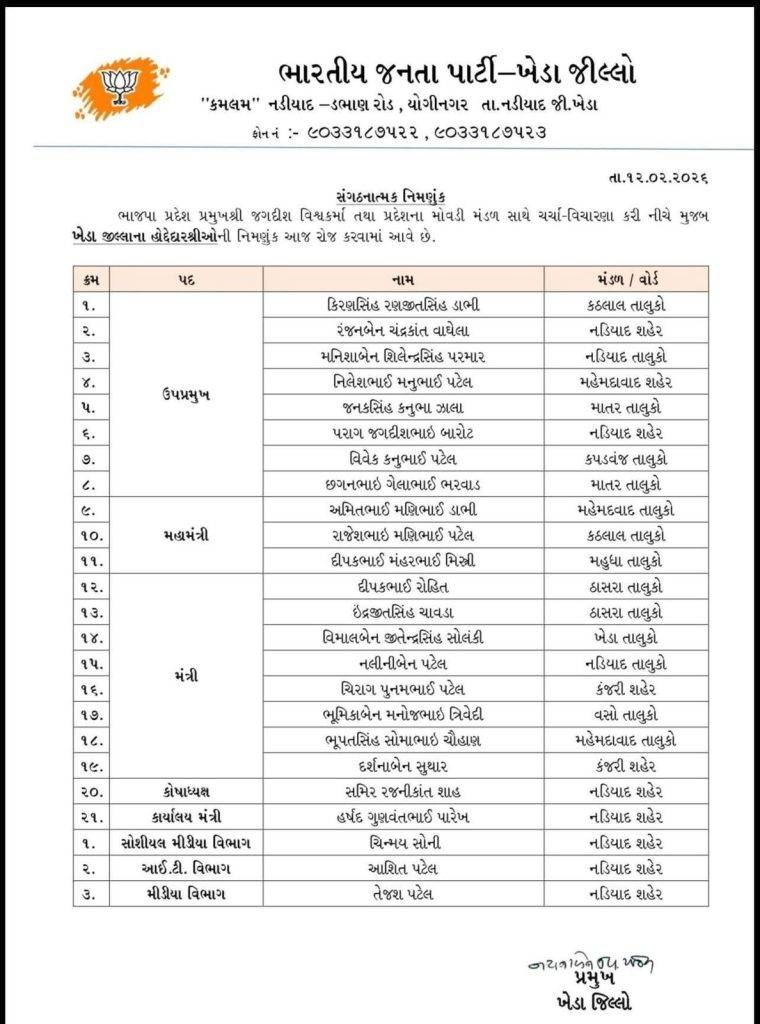 ભારતીય જનતા પાર્ટી, ખેડા જિલ્લા દ્વારા સંગઠનને વધુ મજબૂત અને સક્રિય બનાવવા માટે મહત્વપૂર્ણ સંગઠનાત્મક નિમણૂકો જાહેર કરવામાં આવી છે. ખેડા જિલ્લા ભાજપ કાર્યાલયમાંથી તા. 12-02-2026ના રોજ જાહેર કરાયેલા આદેશ મુજબ જિલ્લા સંગઠન, વિવિધ મોરચા તેમજ વિભાગોમાં પ્રમુખ, ઉપપ્રમુખ, મહામંત્રી, મંત્રી અને અન્ય જવાબદારીઓ સોંપવામાં આવી છે.