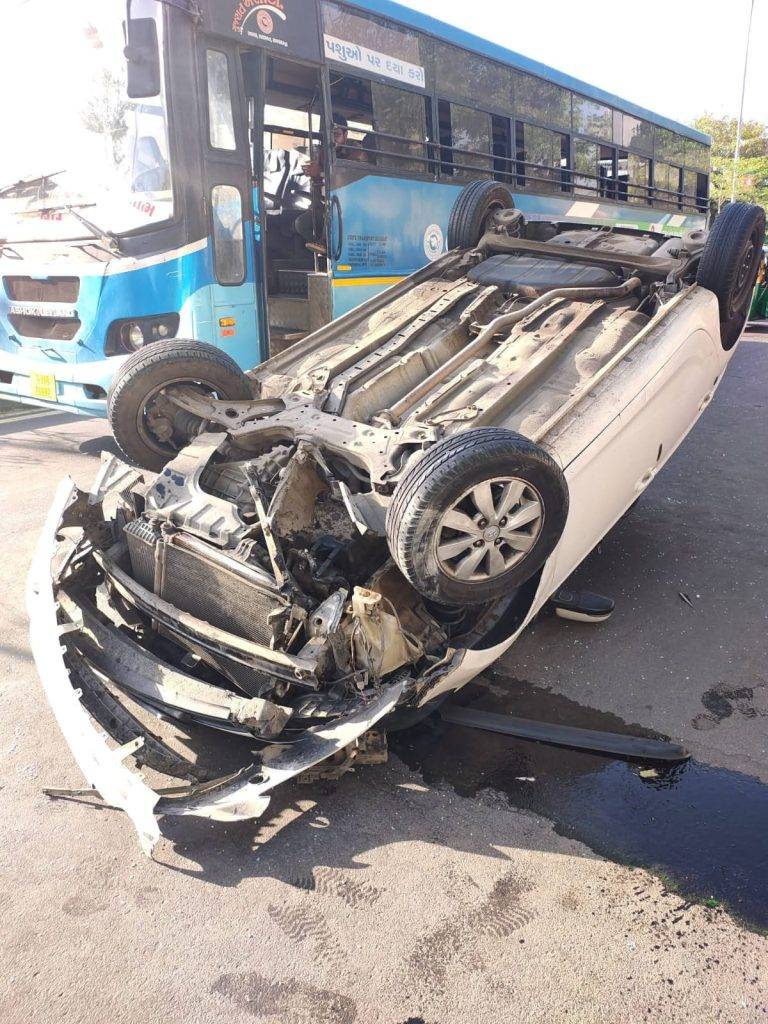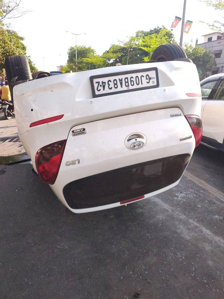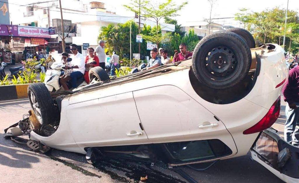 એરપોર્ટ-સંગમ રોડ પર કાર પલટી ખાતા અકસ્માત, 4 લોકોનો આબાદ બચાવ.