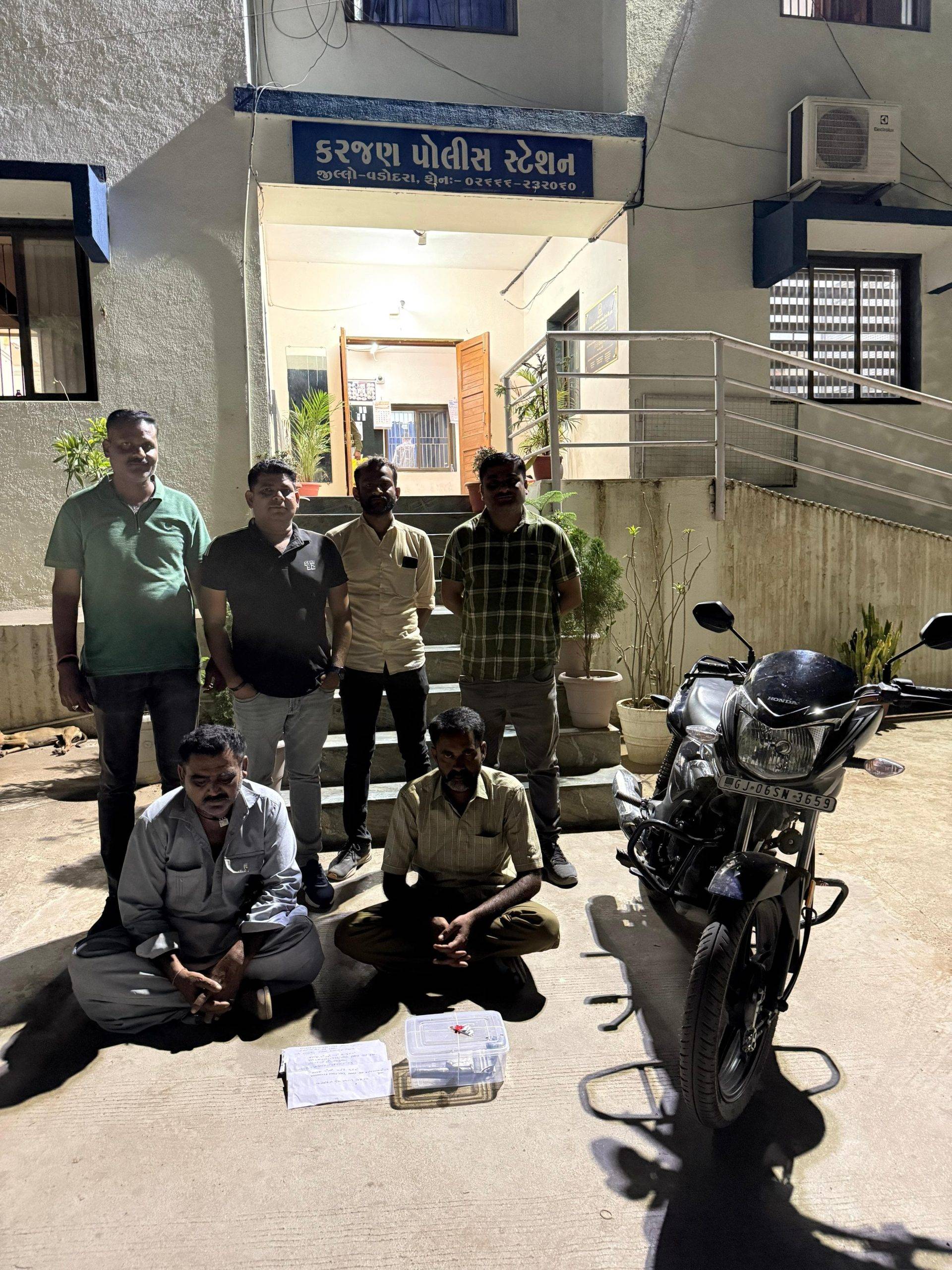 તે દરમિયાન કરજણ પોલીસ સ્ટેશન વિસ્તારમાં પેટ્રોલિંગ દરમિયાન SOG ટીમને બાતમી મળી હતી કે બે ઇસમો મોટરસાયકલ નંબર GJ-06-SN-3659 પર ગેરકાયદેસર હથિયાર સાથે અઝી કુરાલીથી ગણપતપુરા તરફ જઈ રહ્યા છે. બાતમીના આધારે કુરાલી ગામની સીમમાં વોચ ગોઠવી કાર્યવાહી કરવામાં આવી હતી.