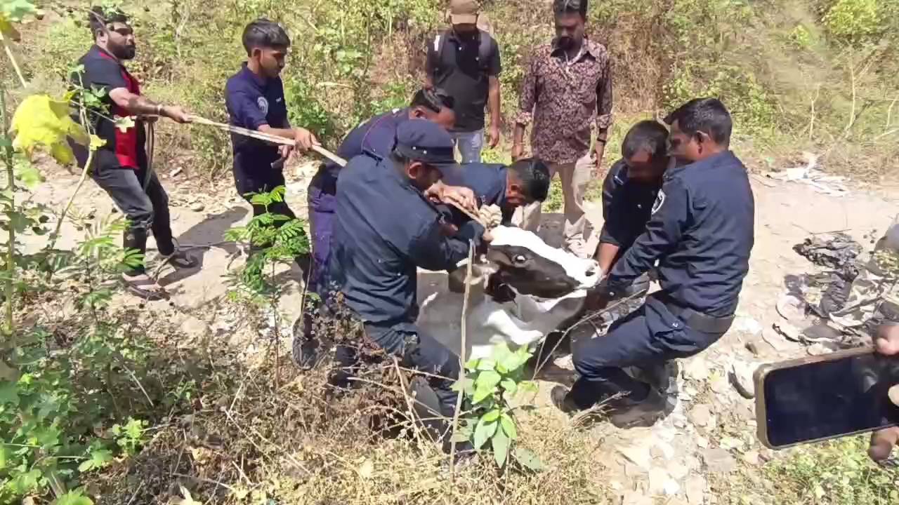 કારેલીબાગ વિસ્તારમાં ખુલ્લી વરસાદી ચેમ્બરમાં પડેલી ગાયનું ફાયર બ્રિગેડે કર્યું સફળ રેસ્ક્યુ