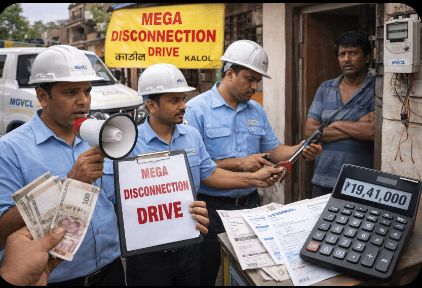 મધ્ય ગુજરાત વીજ કંપની લિમિટેડ (MGVCL) દ્વારા બાકી વીજ બિલની વસૂલાત માટે આક્રમક અભિગમ અપનાવવામાં આવ્યો છે. કાલોલ નગરમાં તા.13 માર્ચથી શરૂ કરાયેલી **‘મેગા ડિસકનેક્શન ડ્રાઈવ’**ના પ્રથમ જ દિવસે તંત્રને મોટી સફળતા મળી છે. વીજ કંપનીએ કડક કાર્યવાહી કરતા એક જ દિવસમાં કુલ ₹19.41 લાખની વસૂલાત કરી છે.