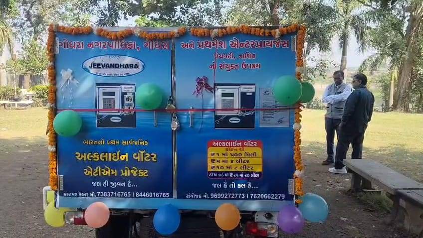 ગુજરાતના ગોધરા શહેરે આરોગ્યપ્રદ સુવિધા ક્ષેત્રે દેશભરમાં અનોખી સિદ્ધિ હાંસલ કરી છે. ગોધરા નગરપાલિકા અને નાસિકની પ્રથમેશ એન્ટરપ્રાઈઝના સંયુક્ત ઉપક્રમે ભારતનું સર્વપ્રથમ સાર્વજનિક ‘આલ્કલાઈન વોટર એટીએમ’ કાર્યરત કરવામાં આવ્યું છે. અટલ ઉદ્યાન ખાતે ધારાસભ્ય સી.કે. રાઉલજીએ આ પ્રોજેક્ટનું વિધિવત લોકાર્પણ કર્યું હતું. આ સુવિધા દ્વારા નાગરિકોને અત્યંત મામૂલી દરે શુદ્ધ અને રોગપ્રતિકારક શક્તિ વધારતું પાણી ઉપલબ્ધ થશે.