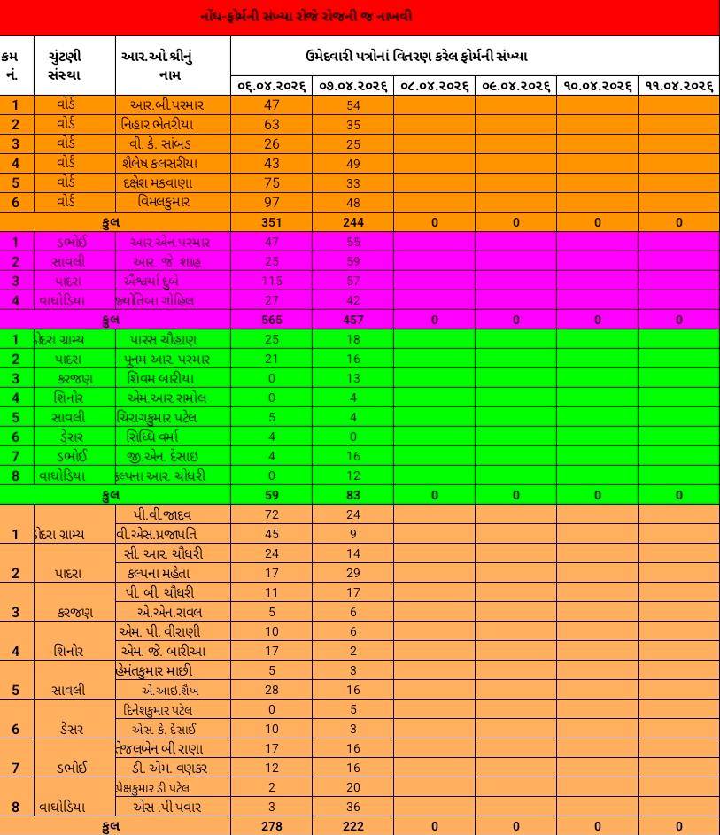 ચૂંટણી અધિકારીઓએ પત્રકની ઉપર જ સ્પષ્ટ સૂચના આપી છે કે, નોંધ :- ફોર્મની સંખ્યા રોજે રોજની જ નાખવી. આ સૂચના પાછળનો હેતુ પારદર્શિતા જાળવવાનો અને કોઈપણ પ્રકારની ગેરરીતિ રોકવાનો છે. 11 એપ્રિલ 2026 સુધી આ પ્રક્રિયા ચાલુ રહેશે, ત્યારબાદ ફોર્મ ચકાસણી અને પરત ખેંચવાની પ્રક્રિયા હાથ ધરાશે.