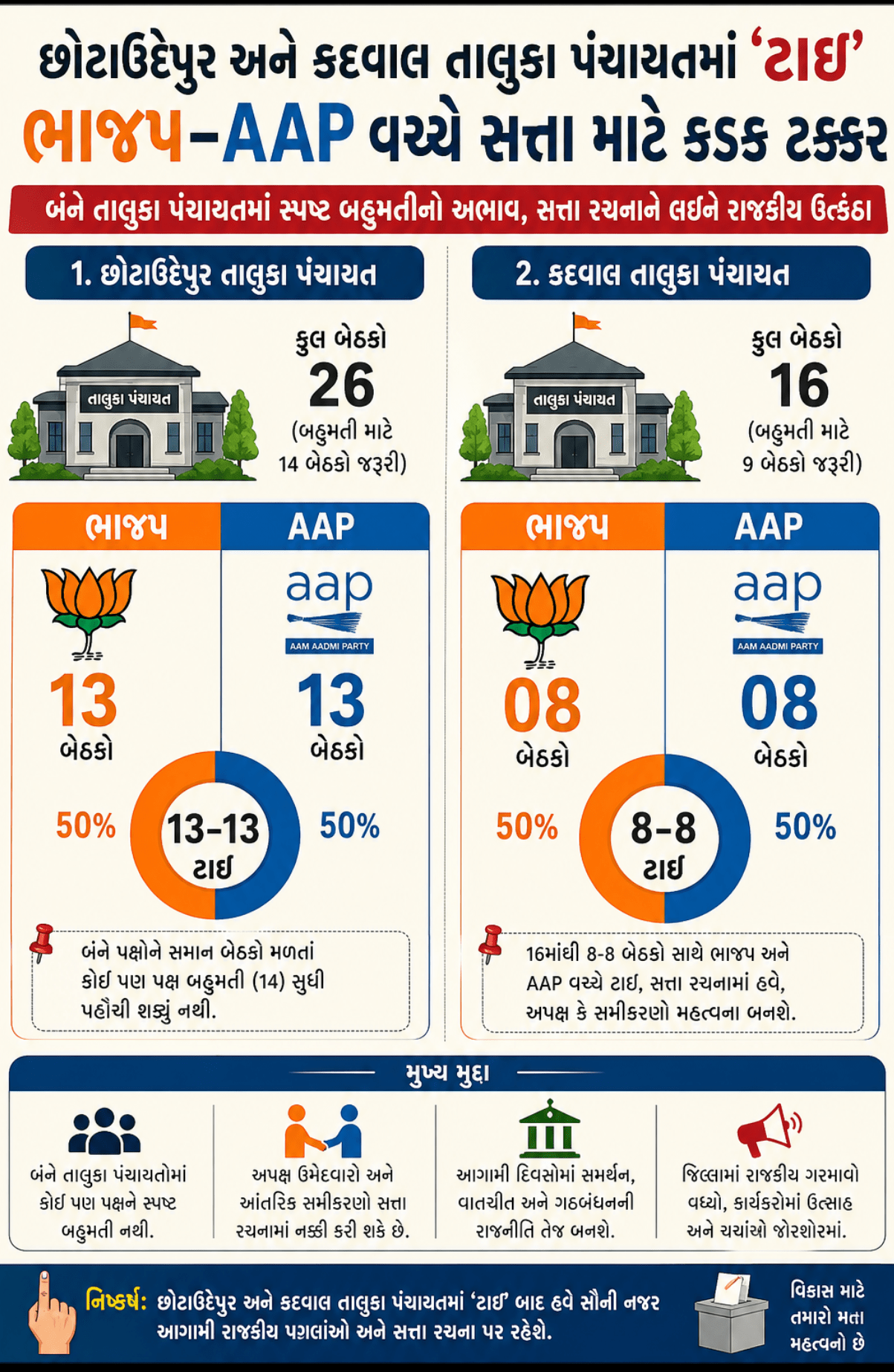 આ જ રીતે કદવાલ તાલુકા પંચાયતમાં પણ સમાન સ્થિતિ સર્જાઈ છે. કુલ 16 બેઠકોમાંથી ભાજપ અને આમ આદમી પાર્ટીએ 8–8 બેઠકો જીતતા અહીં પણ ટાઇની સ્થિતિ ઉભી થઈ છે. બંને તાલુકા પંચાયતોમાં હવે અપક્ષ અથવા આંતરિક રાજકીય સમીકરણો સત્તા રચનામાં મહત્વની ભૂમિકા ભજવશે તેવી શક્યતા વ્યક્ત થઈ રહી છે.