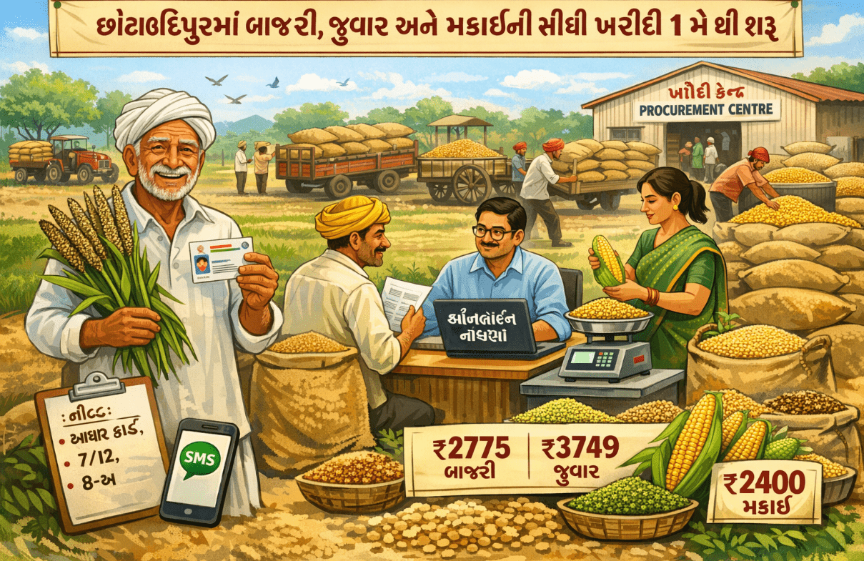 જેતપુર પાવી: છોટાઉદેપુર જિલ્લામાં રવિ માર્કેટિંગ સીઝન ૨૦૨૬-૨૭ અંતર્ગત ખેડૂતો પાસેથી લઘુતમ ટેકાના ભાવે બાજરી, જુવાર તથા મકાઈની સીધી ખરીદી હાથ ધરવામાં આવશે. ભારત સરકાર દ્વારા નક્કી કરાયેલા દર મુજબ બાજરી રૂ. ૨૭૭૫ પ્રતિ ક્વિન્ટલ, જુવાર (માલદંડી) રૂ. ૩૭૪૯ પ્રતિ ક્વિન્ટલ, જુવાર (હાઈબ્રિડ) રૂ. ૩૬૯૯ પ્રતિ ક્વિન્ટલ તથા મકાઈ રૂ. ૨૪૦૦ પ્રતિ ક્વિન્ટલના ભાવે ખરીદી કરવામાં આવશે. ખેડૂતોને વધુ લાભ મળે તે માટે બાજરી અને જુવાર પર રૂ. ૩૦૦ પ્રતિ ક્વિન્ટલ બોનસ પણ ચૂકવાશે.