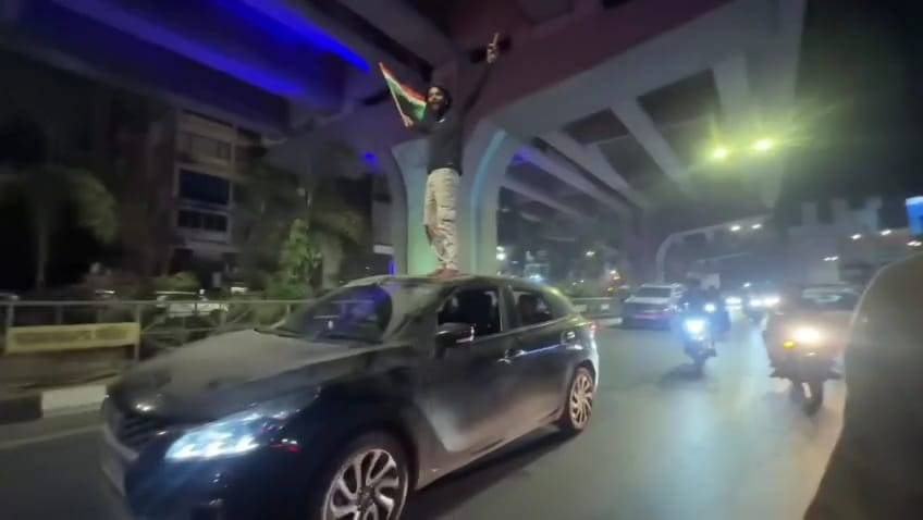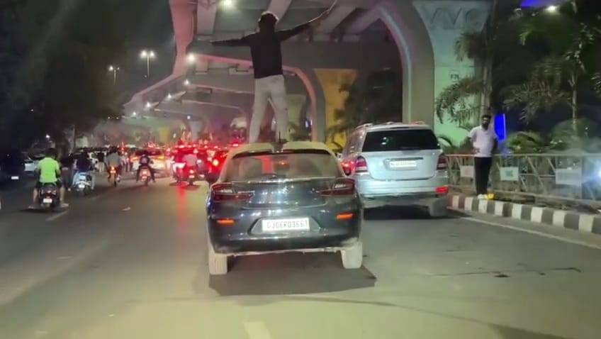 વડોદરામાં ભારતના જીતની વર્લ્ડ કપ જીતની ભવ્ય ઉજવણી કરવામાં આવી હતી. રાત્રી દરમિયાન ક્રિકેટપ્રેમીઓ જાહેર માર્ગ પર ઉમટી પડ્યા હતા અને તિરંગા સાથે જીતનો ઉત્સવ મનાવ્યો હતો. બીજી તરફ આ ઉજવણીમાં એક યુવકે નિયમોના લીરેલીરા ઉડાવી પોતાનો અને અન્યના જીવ જોખમમાં મૂકી દીધા હતા. ભારતની જીતની ઉજવણીરૂપ વિજય રેલી દરમિયાન કાર પર સેફટી વિના ઊભા રહી તિરંગો લઈ નારા લગાવતો યુવકનો વીડિયો સોશિયલ મીડિયા પર વાયરલ થયો હતો. આ ઘટના વડોદરામાં નવનિર્મિત બ્રિજ નીચેના રોડ પર બની હતી. જ્યાં યુવકે ટ્રાફિક સિગ્નલની નજીક પહોચવા છતાં પણ કોઈ ડર વિના ગાડી પર ઊભો રહી નારા લગાવ્યા હતા. જ્યારે આ સમગ્ર ઘટના બાજુમાં બાઈક પર પસાર થઈ રહેલા બીજા યુવકે આ જોખમી સ્ટંટનો વીડિયો પોતાના મોબાઈલમાં કેદ કર્યો હતો. જે વીડિયોમાં યુવક પોલીસને પડકારતો જોઈ શકાય છે. યુવકના આ જોખમી સ્ટંટથી અન્ય વાહનચાલકોમાં આકસ્મિક અકસ્માતનો ભય ફેલાયો હતો.