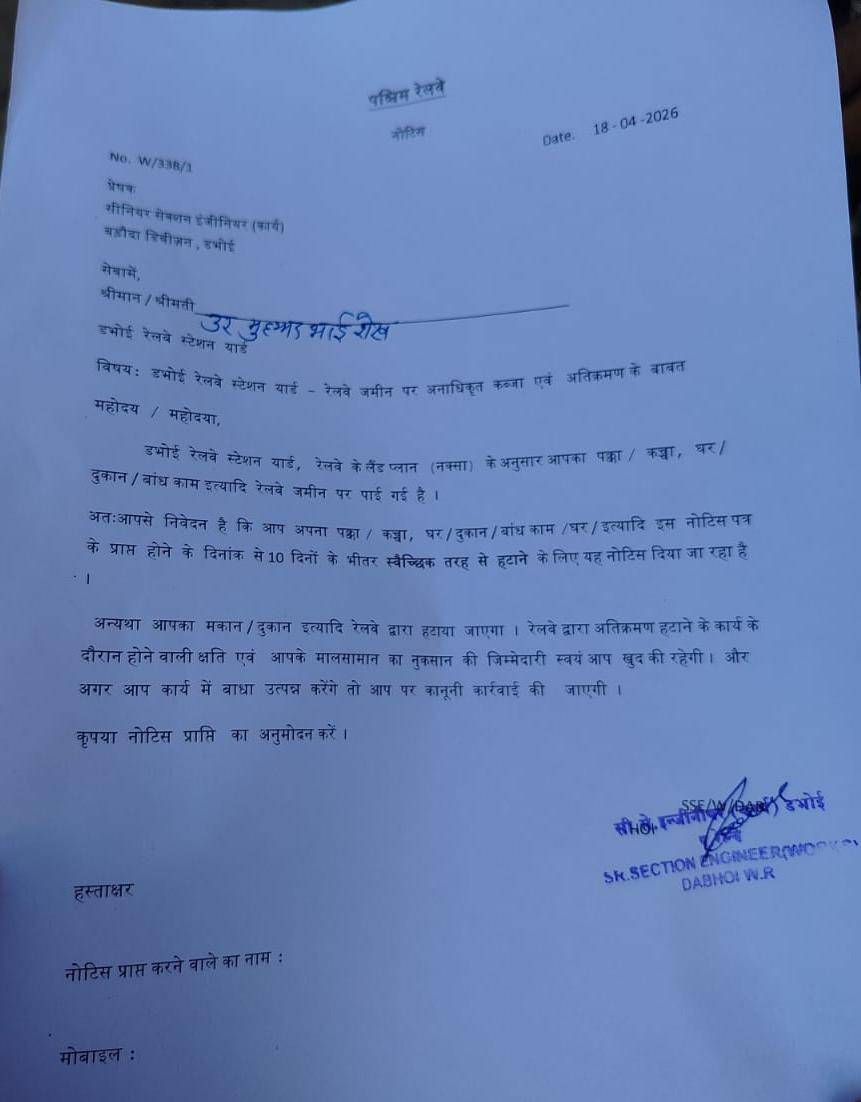 ડભોઇ શહેરના ઈદગાહ અને માછીવાડ ખાડા વિસ્તારમાં રેલ્વે તંત્ર દ્વારા દબાણ દૂર કરવાની નોટિસ આપવામાં આવતા સ્થાનિક રહીશો વચ્ચે ભય અને અનિશ્ચિતતાનો માહોલ સર્જાયો છે. રેલ્વે અધિકારીઓની ટીમે રહીશોને 10 દિવસની અંદર સ્વૈચ્છિક રીતે દબાણ દૂર કરવા સૂચના આપતા વિસ્તારમાં ફફડાટ વ્યાપી ગયો છે.