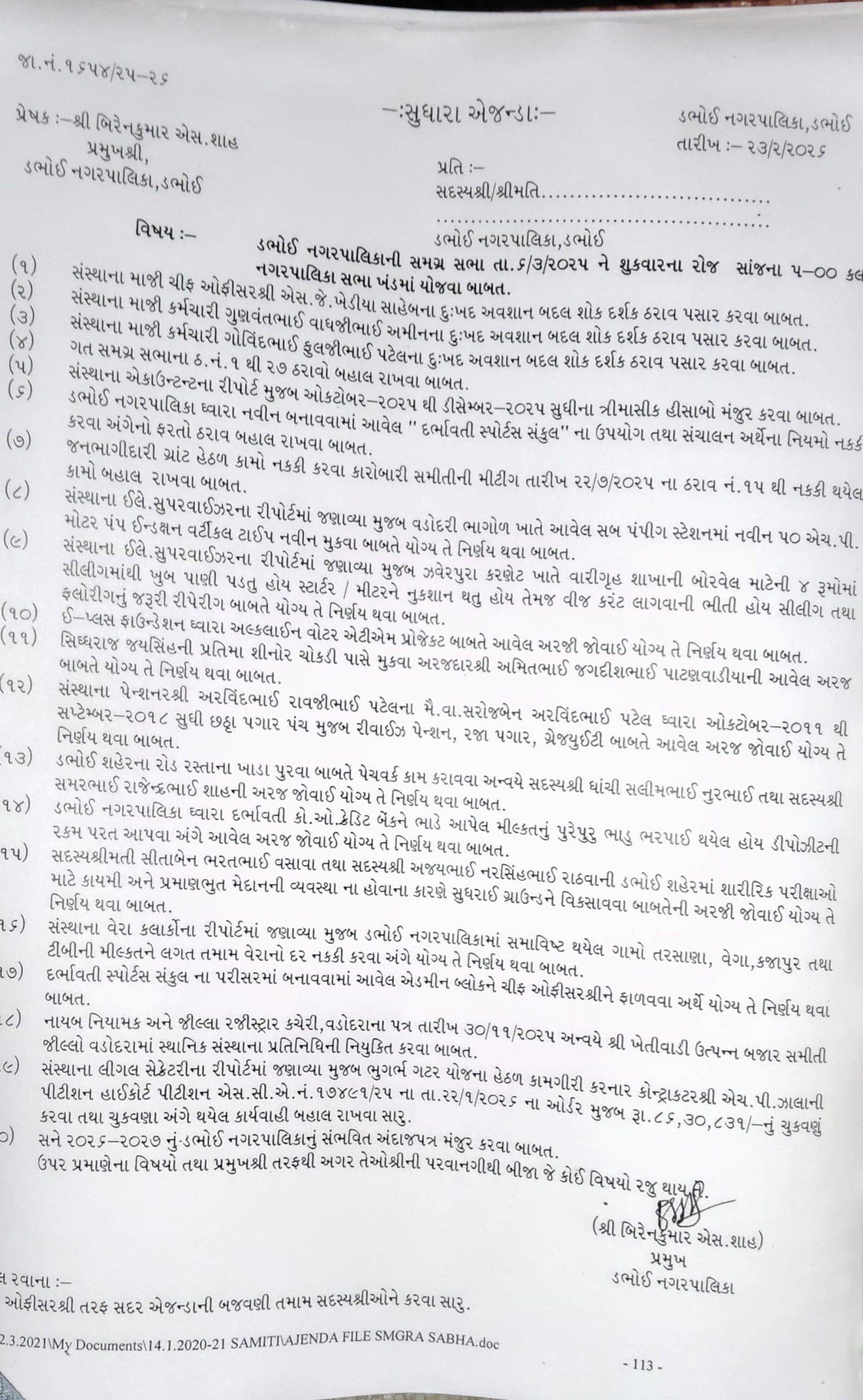 ડભોઇ નગરપાલિકાના વહીવટની ખામીઓ વારંવાર અખબારી કૉલમોમાં છપાઈ ચૂકી છે, જેને લઈ નગરજનોમાં વિવિધ ચર્ચાઓ અને સવાલો ઊભા થયા છે. આવી પરિસ્થિતિ વચ્ચે શુક્રવાર તા. 06/03/2026ના રોજ યોજાવા જઈ રહેલી ડભોઇ નગરપાલિકાની સામાન્ય સભા કદાચ છેલ્લી સામાન્ય સભા બની શકે છે, પરંતુ આશ્ચર્યજનક રીતે આ બેઠકમાં ત્રણ એજન્ડા જારી કરાતા તર્કવિતર્ક સર્જાયા છે.