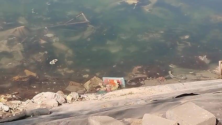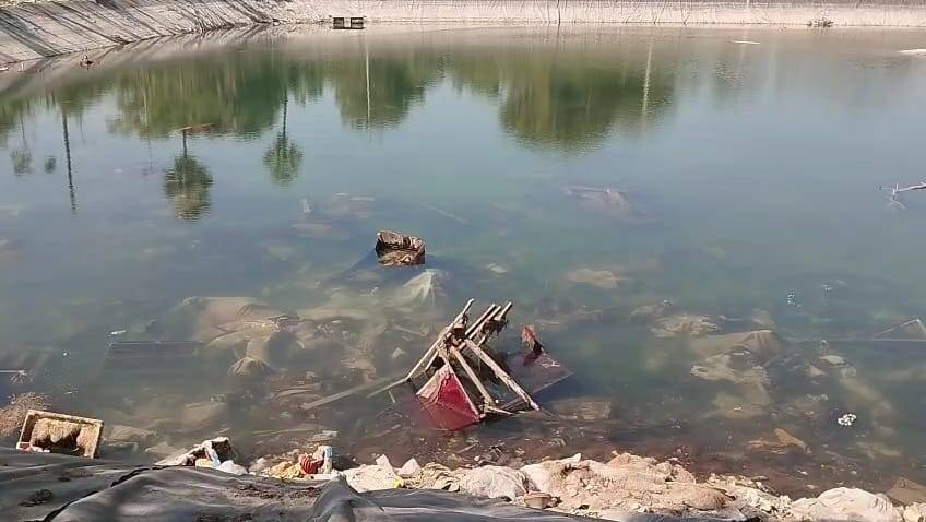 લાકડાં અને ફૂલોનો કચરો તળાવમાં પડ્યો