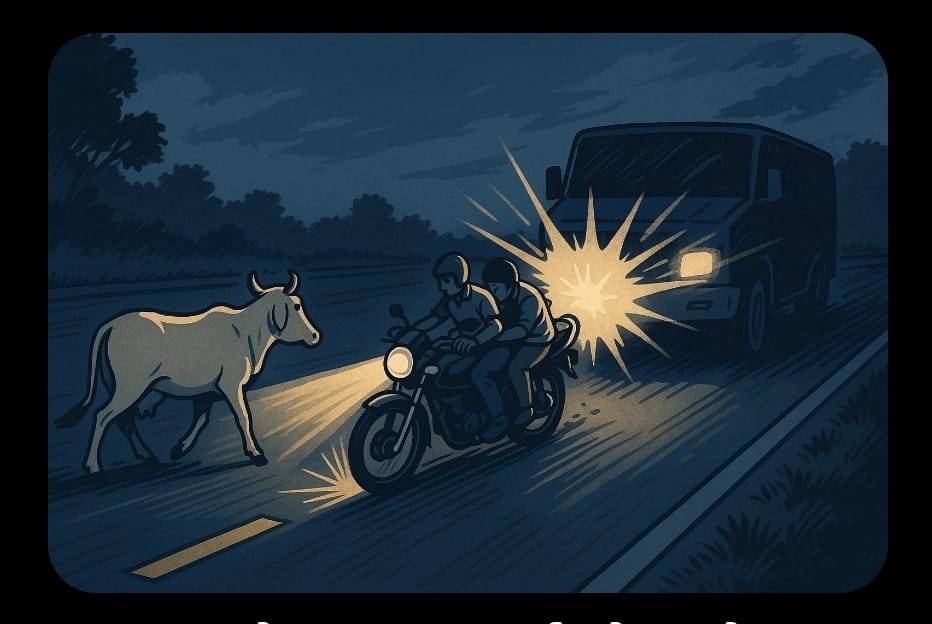ફરીયાદી નિલેશભાઈ કુબેરભાઈ સોનારા (રહે. ગાયત્રીનગર, માણેજા), જે એસ.આર.પી. ગ્રુપ–18, કેવડિયા ખાતે પોલીસ ફરજ બજાવે છે, તેઓ તેમના મિત્ર સંજયભાઈ અર્જુનભાઈ કનોજીયા સાથે 10મી ફેબ્રુઆરીની રાતે સોલાર પ્લાન્ટ સાઇટ નજીક નાસ્તો લેવા નીકળ્યા હતા. રાત્રે પોણા દસ વાગ્યે નિમેટાથી ચંપાલીયાપુરા તરફ જતા, બંગલી પાસે રોડ પર અચાનક એક ગાય આવી ચઢતા નિલેશભાઈએ બાઈક પર બ્રેક મારી હતી.