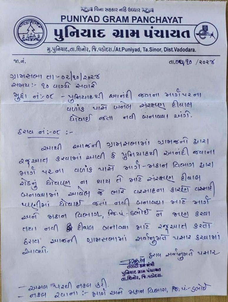 વર્ષ ૨૦૨૪ના ચોમાસા દરમિયાન માર્ગના વળાંક પર બનાવવામાં આવેલી સંરક્ષણ દીવાલ પાણીના વહેણમાં ધરાશાયી થઈ જતા નવી દીવાલ બનાવવા માટે તા. ૨ ઓક્ટોબર ૨૦૨૪ની ગ્રામસભામાં ઠરાવ નંબર ૮ દ્વારા તંત્રને ફરી રજૂઆત કરવામાં આવી હતી. છતાં આજદિન સુધી કોઈ અસરકારક કાર્યવાહી હાથ ધરવામાં આવી નથી.