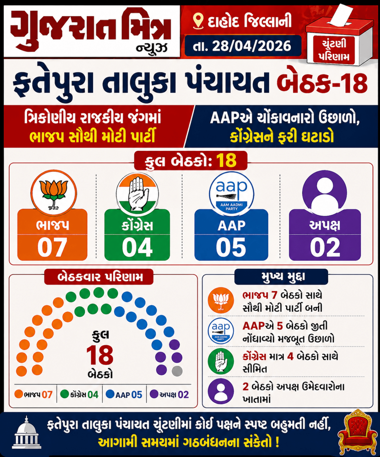 દાહોદ જિલ્લાના ફતેપુરા તાલુકા પંચાયતની કુલ 18 બેઠકો માટે યોજાયેલી ચૂંટણીમાં રસપ્રદ અને ત્રિકોણીય રાજકીય ચિત્ર સામે આવ્યું છે. ભાજપે 7 બેઠકો જીતતા સૌથી મોટી પાર્ટી તરીકે સ્થાન મેળવ્યું છે, પરંતુ સ્પષ્ટ બહુમતીથી દૂર રહ્યું છે. કોંગ્રેસને માત્ર 4 બેઠકો મળતા પરંપરાગત મતબેંકમાં ઘટાડો નોંધાયો છે.