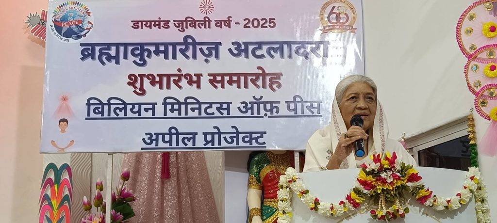 બ્રહ્માકુમારીઝ ગુજરાત ઝોનની ઈશ્વરીય સેવાની 60મી ડાયમંડ જ્યુબિલીના શુભ પ્રસંગે, સમગ્ર ગુજરાતમાં યોજાઈ રહેલા કાર્યક્રમના ભાગ રૂપે, વડોદરાના અટલદરા સેવા કેન્દ્ર ખાતે “બિલિયન મિનિટ્સ ઓફ પીસ અપીલ પ્રોજેક્ટ” શરૂ કરવામાં આવ્યો હતો. આ પ્રોજેક્ટ 24 ઓક્ટોબર યુનાઇટેડ નેશન ડે (UN) થી 21 ડિસેમ્બર વર્લ્ડ મેડીટેશન ડે ના અવસર એ સમાપ્ત થશે આ દરમિયાન એકત્રિત થયેલા 100 કરોડ “શાંતિના મિનિટ્સ”નો અહેવાલ યુનાઇટેડ નેશન્સને મોકલવામાં આવશે.