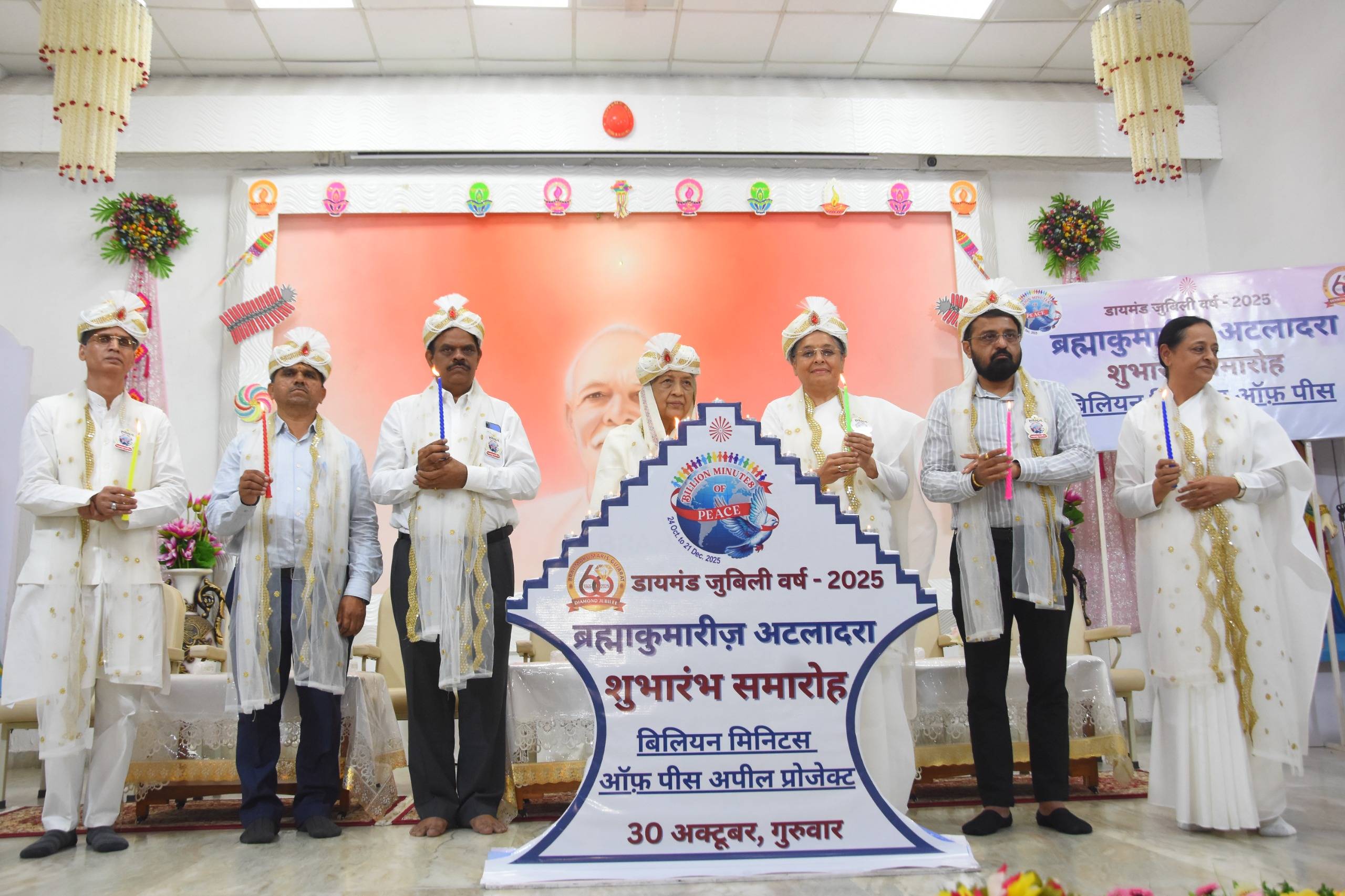 બ્રહ્માકુમારીઝ ગુજરાત ઝોનની ઈશ્વરીય સેવાની 60મી ડાયમંડ જ્યુબિલીના શુભ પ્રસંગે, સમગ્ર ગુજરાતમાં યોજાઈ રહેલા કાર્યક્રમના ભાગ રૂપે, વડોદરાના અટલદરા સેવા કેન્દ્ર ખાતે “બિલિયન મિનિટ્સ ઓફ પીસ અપીલ પ્રોજેક્ટ” શરૂ કરવામાં આવ્યો હતો. આ પ્રોજેક્ટ 24 ઓક્ટોબર યુનાઇટેડ નેશન ડે (UN) થી 21 ડિસેમ્બર વર્લ્ડ મેડીટેશન ડે ના અવસર એ સમાપ્ત થશે આ દરમિયાન એકત્રિત થયેલા 100 કરોડ “શાંતિના મિનિટ્સ”નો અહેવાલ યુનાઇટેડ નેશન્સને મોકલવામાં આવશે.