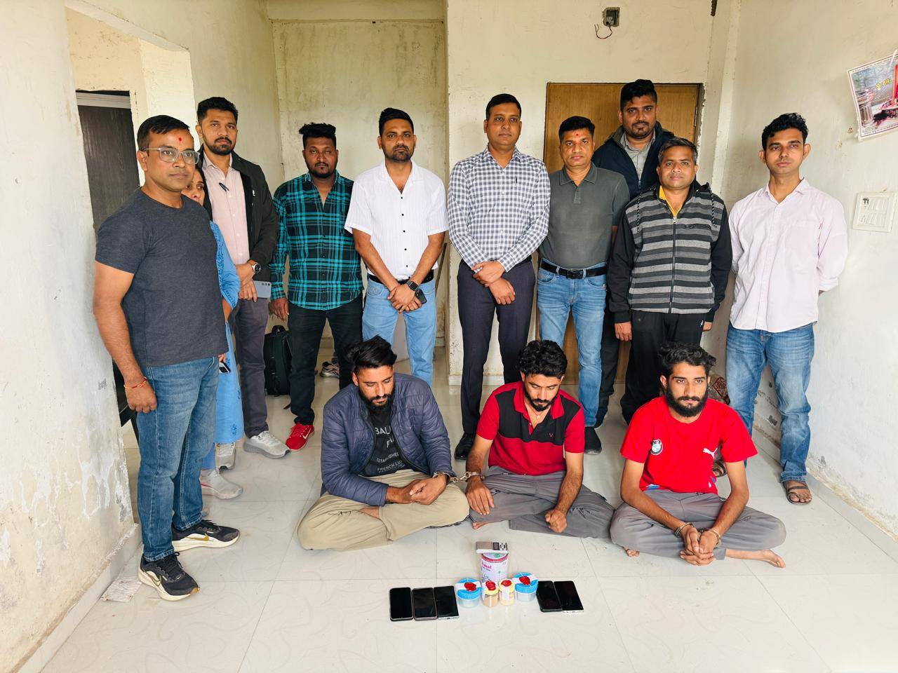 રેઇડ દરમિયાન પોલીસે ઝડપાયેલા ત્રણ પૈકી શ્રવણકુમાર મનોહરરામ બકતારામ બિશ્નોઇ,મહિપાલ ક્રિષ્ણારામ ભગ્વાનારામ બિશ્નોઇ બંને રહે. જોધપુર, રાજસ્થાન અને પ્રદિપ રાજુરામ ભાકરરામ બિશ્નોઇ (રહે. ફલોદી, રાજસ્થાન) નામના 3 આરોપીઓને તેમના ભાડાના મકાનમાંથી ઝડપી પાડ્યા હતા. આ ઇસમોએ આર્થિક લાભ માટે આ પ્રતિબંધિત કેફી પદાર્થો સંજય બિશ્નોઇ (રહે. લોહાવટ, જોધપુર, રાજસ્થાન) પાસેથી લાવી અન્યને વેચાણ કરવા માટે રાખ્યા હતા.