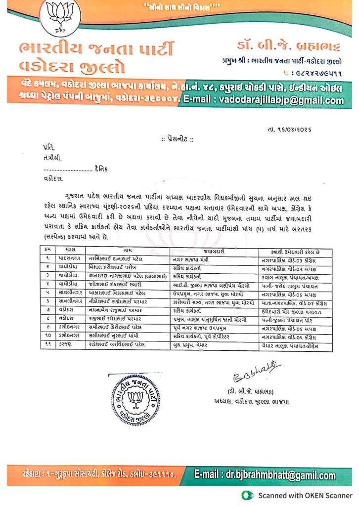 ગુજરાત પ્રદેશ ભાજપ અધ્યક્ષની સૂચના અનુસાર, જે કાર્યકરો પક્ષમાં જવાબદારી ધરાવે છે અથવા સક્રિય છે, છતાં તેઓએ સ્થાનિક સ્વરાજ્યની ચૂંટણી-2026માં પક્ષના શિસ્તનો ભંગ કર્યો છે, તેમની સામે આ પગલું લેવામાં આવ્યું છે. વડોદરા જિલ્લા ભાજપ કાર્યાલય ‘વંદે કમલમ’ ખાતેથી જારી કરાયેલ યાદીમાં પાદરા, વાઘોડિયા, સાવલી, ડભોઈ અને કરજણ જેવા તાલુકાઓના અગ્રણીઓનો સમાવેશ થાય છે.
