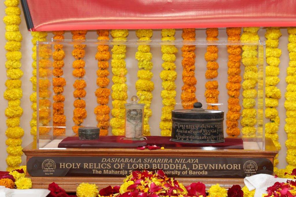 ભગવાન બુદ્ધના અસ્થિ સહિતના આઠમી સદીના આ પવિત્ર અવશેષો મહારાજા સયાજીરાવ યુનિવર્સિટી ઓફ બરોડામાં સુરક્ષિત રાખવામાં આવ્યા છે અને તેને દિલ્હીથી શ્રીલંકા મોકલવામાં આવશે. તે શ્રીલંકન નૂતન વર્ષે કોલંબો પહોંચશે. પીએમ મોદીના વર્ષ 2025 દરમિયાનની શ્રીલંકાના પ્રવાસ દરમિયાન ભારત અને શ્રીલંકા વચ્ચે સાંસ્કૃતિક આદાનપ્રદાન વધુ ઘનિષ્ટ કરવા માટે સહમતી સાધવામાં આવી હતી. તે પરિપ્રેક્ષ્યમાં બુદ્ધધર્મની બહુમતી ધરાવતા શ્રીલંકામાં આ અવશેષો તેના નૂતન વર્ષે મોકલવામાં આવી રહ્યા છે. રાજ્યપાલ આચાર્ય દેવવ્રત અને નાયબ મુખ્યમંત્રી હર્ષભાઇ સંઘવીના નેતૃત્વમાં ગુજરાતનું પ્રતિનિધિ મંડળ દિલ્હી ખાતેથી આ પવિત્ર અવશેષોને રવાના કરશે. મહારાજા સયાજીરાવ યુનિવર્સિટી ઓફ બરોડાના ચાર પ્રોફેસર પણ કોલંબો જશે. મુખ્યમંત્રી ભૂપેન્દ્ર પટેલ બપોર બાદ યુનિવર્સિટીના સયાજીગંજ કેમ્પસ સ્થિત ડિપાર્મેન્ટ ઓફ આર્કિયોલોજી એન્ડ એન્સીઅન્ટ સ્ટીડીમાં પહોંચ્યા હતા. તેઓ અહીં પહોંચ્યા ત્યારે યુનિવર્સિટીમાં અભ્યાસ કરતા વિદેશી વિદ્યાર્થીઓ દ્વારા તેમનું સ્વાગત કરવામાં આવ્યું હતું. તત્પશ્ચાત, મુખ્યમંત્રી અને મહાનુભાવોએ સંગ્રહાલયની મુલાકાત લીધી હતી. બુદ્ધ સાધુઓ દ્વારા પવિત્ર મંત્રોનું ગાન કરવામાં આવ્યું હતું. મુખ્યમંત્રીએ પુષ્પાંજલિ અર્પણ કરી હતી. તેઓ પવિત્ર અવશેષોને સંગ્રહાલયમાંથી બહાર લઇ આવ્યા હતા. આ વિધિમાં બુદ્ધિસ્ટ મોંક મહાબોધી સોસાયટીના સંત શ્રી આનંદા, શ્રી વિચિત્તા, શ્રી ઉગસેન અને શ્રી પનાતિકા પણ જોડાયા હતા. મુખ્યમંત્રી ભૂપેન્દ્ર પટેલની ઉપસ્થિતિમાં વડોદરા શહેર પોલીસની એક ટૂકડી દ્વારા ભગવાન શ્રી બુદ્ધના પવિત્ર અવશેષોને ગાર્ડ ઓફ ઓનર આપવામાં આવ્યું હતું. બાદમાં તેને એક વાહનમાં સુરક્ષિત રીતે રાખી શોભાયાત્રા યોજવામાં આવી હતી. આ પવિત્ર અવશેષોને ફ્લાઇટ મારફત દિલ્હી મોકલવામાં આવ્યા હતા. ભગવાન બુદ્ધના અસ્થિ સાથેની મંજૂષા, સિલ્કનું વસ્ત્ર સાથેનું પાત્ર, પથ્થરમાંથી બનાવેલા ઢાંકણાવાળા ખડિયા જેવા બોક્સનો આ અવશેષોમાં સમાવેશ થાય છે. આ બોક્સ ઉપર ચાંદી, સોનાના તાર ચઢાવવામાં આવ્યા છે. જેના ઉપર બ્રાહ્મી લિપિ અને સંસ્કૃતમાં દશબલ શરીર નિલય એવું લખાણ વાંચવા મળે છે. જેનો મતલબ થાય છે કે, દશબલ એટલે કે ભગવાન શ્રી બુદ્ધના અવશેષોનું સ્થાન. ધાર્મિક અને ઐતિહાસિક મહત્વ ધરાવતા આ અવશેષોને શ્રીલંકાના કોલંબોમાં તા.4 થી 11 ફેબ્રુઆરી સુધી ચાલનારા એક કાર્યક્રમમાં દર્શનાર્થે મૂકવામાં આવશે. આ પ્રસંગે રાજમાતા શુભાંગિનીદેવી ગાયકવાડ, કુલપતિ ભલચંદ્ર ભણગે, ભાજપ અધ્યક્ષ જયપ્રકાશ સોની, પોલીસ કમિશનર નરસિમ્હા કોમર, મ્યુનિસિપલ કમિશનર, કલેક્ટર આર્કિયોલોજી વિભાગના ડિન સુશ્મિતા સેન પણ જોડાયા હતા.