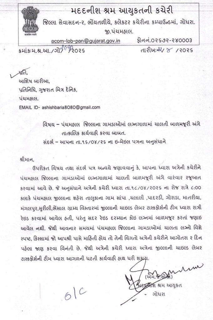 પંચમહાલ જિલ્લાના ગામડાઓમાં લગ્નગાળામાં ખુલ્લેઆમ ચાલતી બાળમજૂરી અંગે અહેવાલો અને પુરાવાઓ રજૂ કરી તંત્રને ઢંઢોળવાનો પ્રયાસ કરવામાં આવ્યો હતો. પરંતુ પોતાની નિષ્ફળતા છુપાવવા અને જવાબદારીમાંથી છટકવા માટે ગોધરાની મદદનીશ શ્રમ આયુક્ત કચેરી દ્વારા જવાબદારીમાંથી હાથ ખંખેરતો પત્ર પાઠવવામાં આવ્યો છે. શ્રમ વિભાગે પત્રકારને સત્તાવાર પત્ર લખીને જણાવ્યું છે કે જો લગ્ન પ્રસંગમાં ક્યાંય બાળમજૂરી થતી હોય તો તેની માહિતી પત્રકારે બે દિવસ પહેલાં કચેરીને આપવી, જેથી વિભાગ કાર્યવાહી કરી શકે. આ દર્શાવે છે કે કાયદાનું પાલન કરાવવાની પોતાની બંધારણીય ફરજ શ્રમ વિભાગ હવે મીડિયા પર ઢોળી રહ્યું છે.