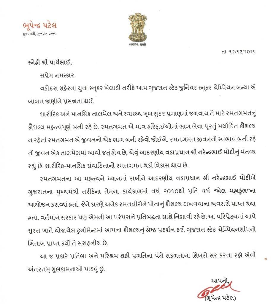 મુખ્યમંત્રીએ પાર્થને પાઠવેલા પ્રશસ્તિપત્રમાં જણાવ્યું હતું કે, રમતગમતના મહત્ત્વને ધ્યાનમાં રાખીને વર્ષ 2010થી ગુજરાતમાં ‘ખેલ મહાકુંભ’નું આયોજન શરૂ કરવામાં આવ્યું હતું, જેના પરિણામે અનેક રમતવીરોને પોતાની પ્રતિભા દર્શાવવાની તક મળી છે. વર્તમાન સરકાર પણ આ પરંપરાને પ્રતિબદ્ધતાપૂર્વક આગળ વધારી રહી છે.