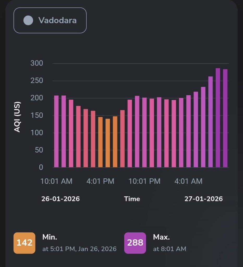 વાતાવરણમાં ભેજની સાથે પ્રદૂષણ વધતા આજે સવારે 7 થી 8 વાગ્યાની વચ્ચે વડોદરા શહેરનું મહત્તમ AQI 288 નોંધાયું હતું. જ્યારે છેલ્લા 24 કલાકના સરેરાશ AQIના આંકડા મુજબ શહેરનો AQI 272 નોંધાયો છે. નોંધનીય છે કે, 300 AQIથી હેઝાર્ડસ (અતિ ગંભીર) હવામાનની શરૂઆત થાય છે. ત્યારે વડોદરા શહેર 300 AQIથી માત્ર 12 પોઈન્ટ દૂર હોવાને કારણે પ્રદૂષણનું નવું અને ખતરનાક સ્તર જોવા મળી રહ્યું છે.