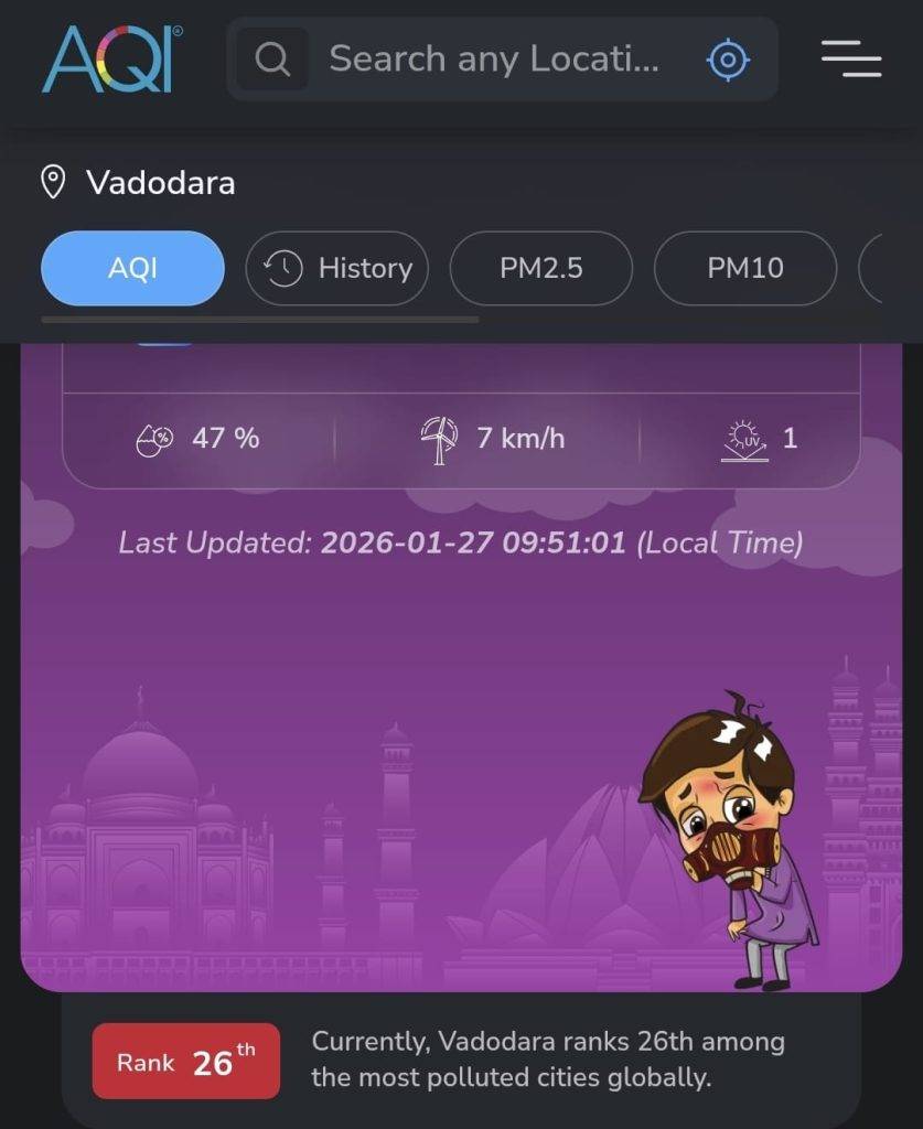 AQI વેબસાઈટના ડેટા મુજબ વિશ્વના સૌથી વધુ પ્રદૂષિત શહેરોમાં વડોદરાનો ક્રમાંક 26મો