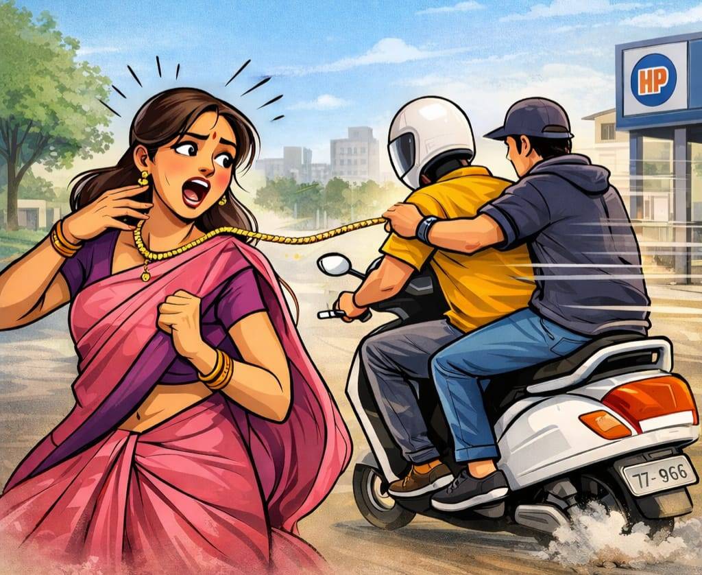 હરણી વારસિયા રિંગ રોડ પાસે રહેતા પ્રિયંકાબેન કુમાર ખેમચંદ ચાંગલાની (ઉંમર 30)એ નોંધાવેલી ફરિયાદ મુજબ, 01 એપ્રિલ 2026ના રોજ સવારે લગભગ 7:15 વાગ્યાના અરસામાં તેઓ એકટીવા શીખવા માટે કારેલીબાગમા આવેલા અડુકયો-દડુકયો ગ્રાઉન્ડ ખાતે ગયા હતા. ડ્રાઈવિંગ પ્રેક્ટિસ પૂરી કરીને તેઓ પગપાળા પરત ફરી રહ્યા હતા ત્યારે ગ્રાઉન્ડની બહાર, એચ.પી. પેટ્રોલપંપ પાસે, એકટીવા પર આવેલા બે અજાણ્યા શખ્સ નજીક આવ્યા હતા.