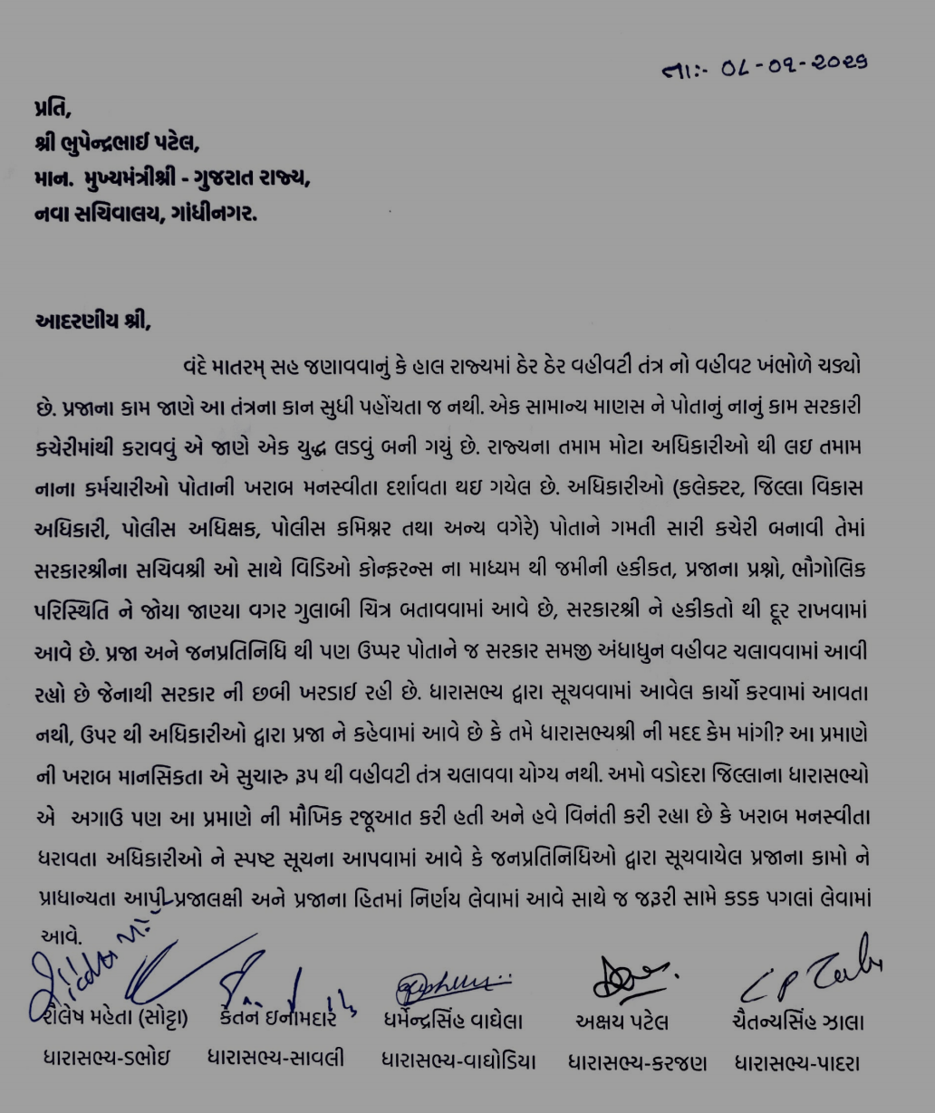 આ પત્ર પર વડોદરા જિલ્લાના ભાજપના ધારાસભ્યોના હસ્તાક્ષર છે, જે બતાવે છે કે અસંતોષ માત્ર અંદરખાને નથી, હવે ખુલ્લેઆમ ફાટી નીકળ્યો છે.