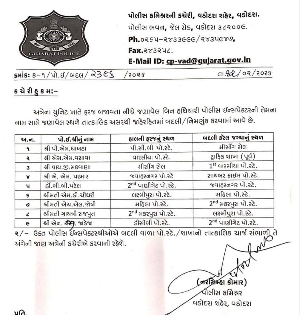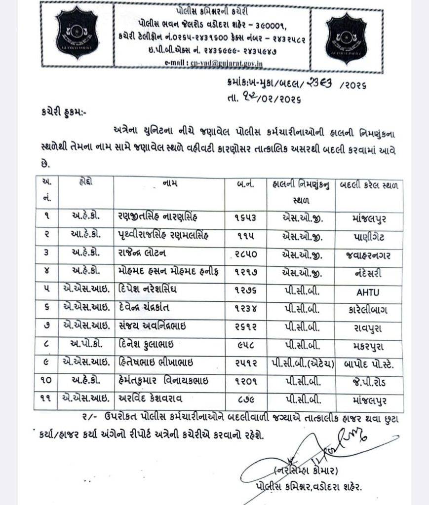વડોદરા શહેર પોલીસ કમિશનર નરસિંહા કોમાર દ્વારા શહેર પોલીસ દળમાં વહીવટી હિતમાં મહત્વપૂર્ણ બદલીના આદેશ જાહેર કરવામાં આવ્યા છે. પોલીસ કમિશનરની કચેરીમાંથી તા. 12/02/2026ના રોજ જાહેર કરાયેલા આદેશ મુજબ વિવિધ પોલીસ સ્ટેશનો, બ્રાન્ચો અને યુનિટોમાં ફરજ બજાવતા પોલીસ અધિકારીઓ અને કર્મચારીઓની તાત્કાલિક અસરથી બદલી તથા નિમણૂક કરવામાં આવી છે.