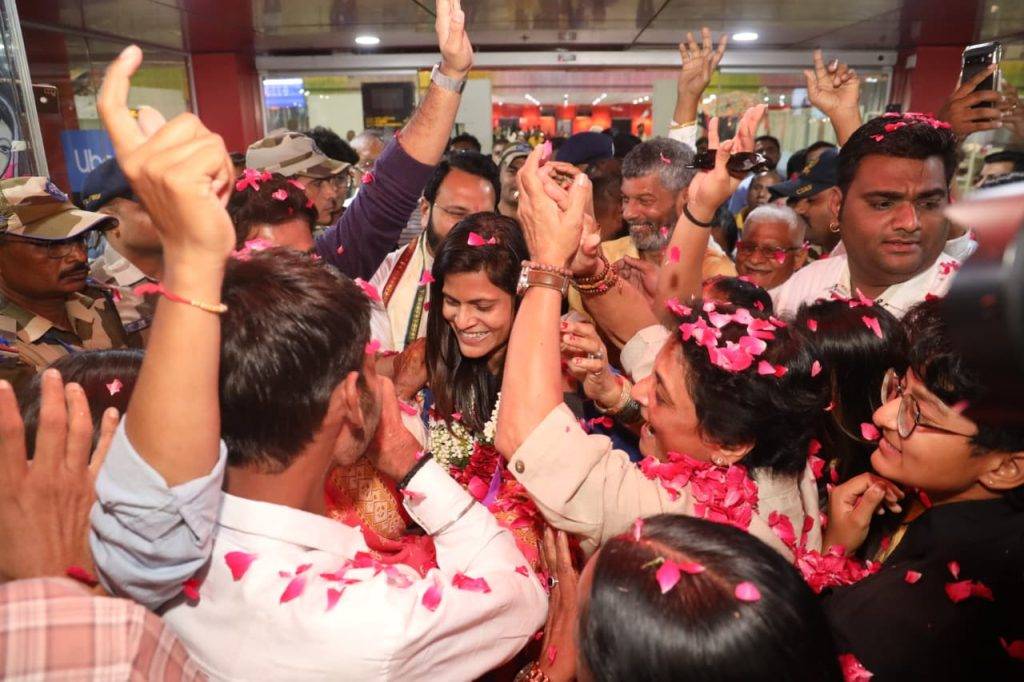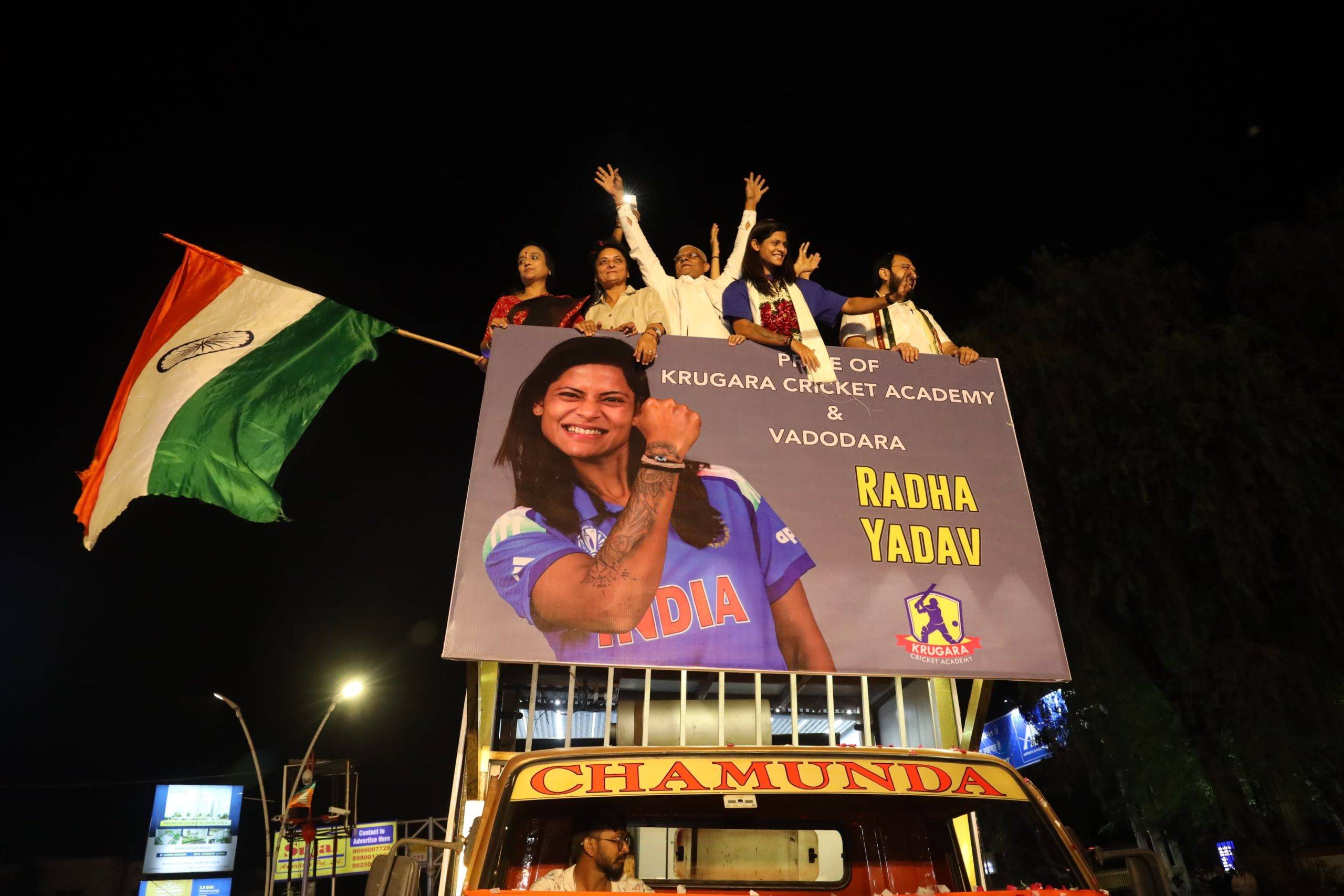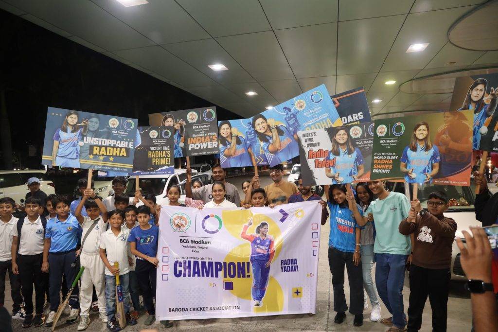 આઇસીસી વુમન્સ ક્રિકેટ વર્લ્ડ કપમાં ચેમ્પિયન ટીમ ઇન્ડિયાની ઓલ રાઉન્ડ અને બરોડીયન રાધા યાદવ વડોદરામાં હવાઈ માર્ગે આવી પહોંચી હતી. એરપોર્ટ પર ક્રિકેટ પ્રેમીઓ મોટી સંખ્યામાં ઉમટી પડયા હતા. જે બાદ એરપોર્ટથી છ કિલોમીટરનો તેનો ભવ્ય રોડ શો યોજાયો હતો. જેમાં સાંસદ,મેયર, કાઉન્સિલરો સહિત રાજકારણીઓ જોડાયા હતા.