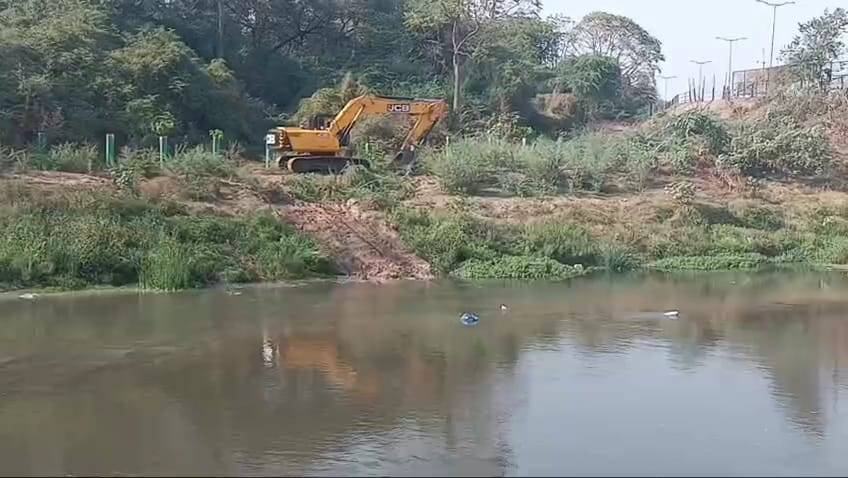ગેબિયન વોલની કામગીરી દરમિયાન નદીમાં મશીન ઉતારાતા પ્રાણીપ્રેમીઓની ચિંતા
