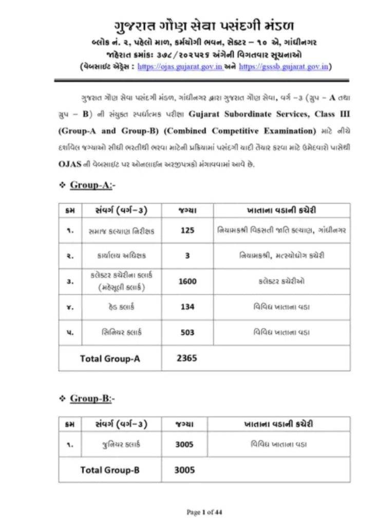 ગુજરાત ગૌણ સેવા પસંદગી મંડળ દ્વારા રાજ્ય સરકારના વિવિધ વિભાગોમાં કલાસ-3 (ગ્રુપ-A અને ગ્રુપ-B) માટે સંયુક્ત સ્પર્ધાત્મક પરીક્ષાની જાહેરાત કરવામાં આવી છે. આ ભરતી પ્રક્રિયા અંતર્ગત કુલ 5,370થી વધુ જગ્યાઓ ભરવામાં આવશે. 5 ફેબ્રુઆઆરીથી ઓનલાઈન અરજી કરી શકાશે.