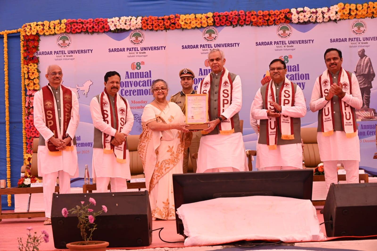 આણંદ:; સરદાર પટેલ યુનિવર્સિટી, વલ્લભ વિદ્યાનગરના ૬૮માં દીક્ષાંત સમારંભમાં સ્વાધ્યાય પ્રવૃત્તિના પ્રેરક બળ અને વૈશ્વિક નેતૃત્વ પૂરું પાડનાર પૂજ્ય દીદીજી (શ્રીમતી જયશ્રી ઉર્ફે ધનશ્રી આઠવલે તલવલકર) ને તેમના અપ્રતિમ સામાજિક, શૈક્ષણિક અને આધ્યાત્મિક યોગદાન બદલ ‘Doctor of Letters’ (D.Litt.) ની રાજ્યપાલ આચાર્ય દેવવ્રતના હસ્તે માનદ પદવીથી વિભૂષિત કરવામાં આવ્યા હતા.