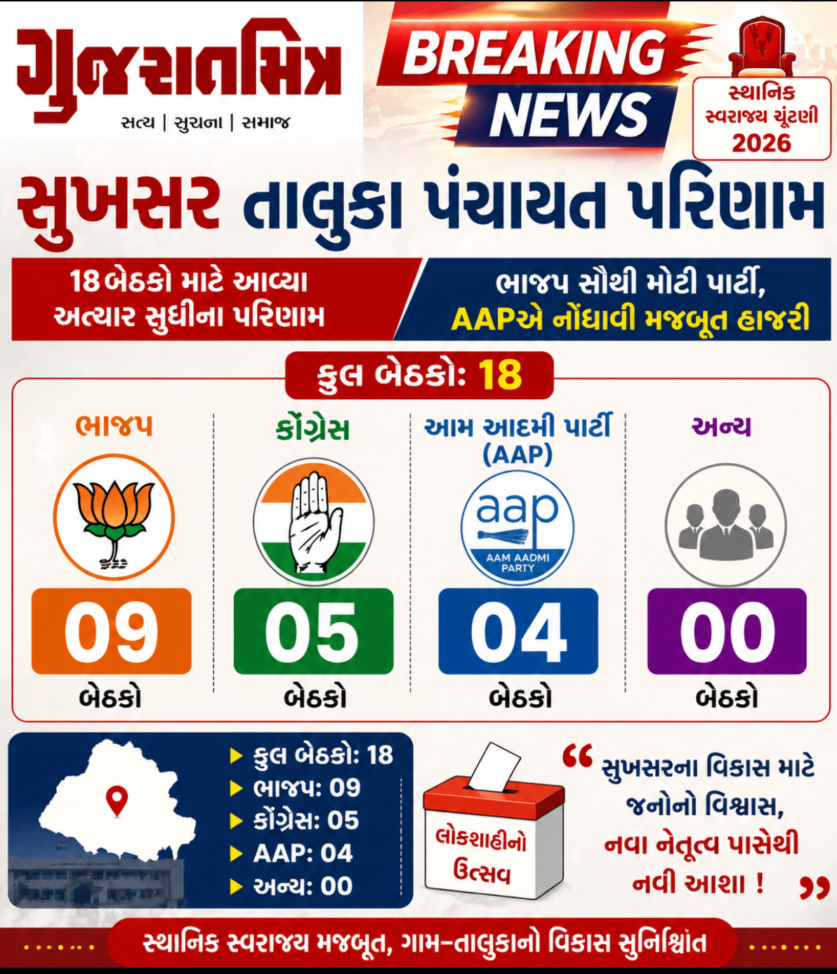 સુખસર તાલુકા પંચાયતની કુલ 18 બેઠકોના અત્યાર સુધી જાહેર થયેલા પરિણામોમાં ભાજપ 9 બેઠકો સાથે સૌથી મોટી પાર્ટી તરીકે ઉભરી આવ્યું છે. કોંગ્રેસે 5 બેઠકો જીતતા પોતાનું રાજકીય સ્થાન જાળવી રાખ્યું છે, જ્યારે આમ આદમી પાર્ટીએ 4 બેઠકો મેળવી તાલુકા સ્તરે નોંધપાત્ર હાજરી નોંધાવી છે.
