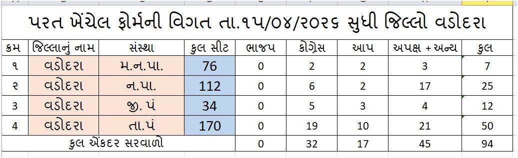 વડોદરા જિલ્લામાં આગામી સ્થાનિક સ્વરાજની ચૂંટણીઓને લઈને રાજકીય ગરમાવો ચરમસીમાએ પહોંચ્યો છે. 15 એપ્રિલ 2026 સુધીની સ્થિતિએ ઉમેદવારી પત્રો પરત ખેંચવાની પ્રક્રિયા પૂર્ણ થતા જ હવે ચૂંટણીનું આખરી ચિત્ર સ્પષ્ટ થઈ ગયું છે. વડોદરા જિલ્લાની મહાનગરપાલિકા, નગરપાલિકા, જિલ્લા પંચાયત અને તાલુકા પંચાયત બેઠકો પરથી કુલ 94 ઉમેદવારોએ પોતાના ફોર્મ પરત ખેંચી લીધા છે, જેમાં સૌથી વધુ અપક્ષ ઉમેદવારોનો સમાવેશ થાય છે.