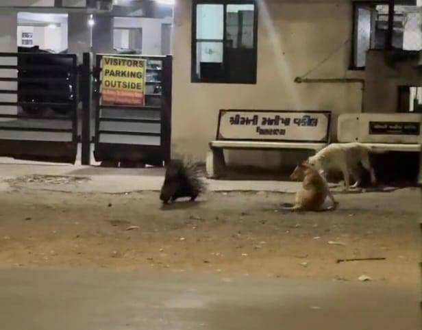 હરણી મોટનાથ વિસ્તારમાં આવેલા ગોવર્ધન પાર્ટી પ્લોટ પાસે શાહુડી રોડ પર આવી ગઈ હતી. શાહુડીને જોઈને કેટલાક શ્વાનો પૈકી એક શ્વાને શાહુડીને ઘેરવાનો પ્રયાસ પણ કર્યો હતો. પરંતુ, શરીરે કાંટા ધરાવતી આ શાહુડી સાથે બાથ ભીડવી શક્ય ન હોય, શ્વાનોએ મેદાન છોડવું પડ્યું હતું અને શાહુડી તેના રસ્તે નીકળી ઝાડી વિસ્તારમાં જતી રહી હતી. આ સમગ્ર ઘટનાનો વીડિયો ત્યાંથી પસાર થઈ રહેલા કેટલાક યુવકો પૈકી એકે પોતાના મોબાઈલમાં કેદ કરી લીધા હતા.
