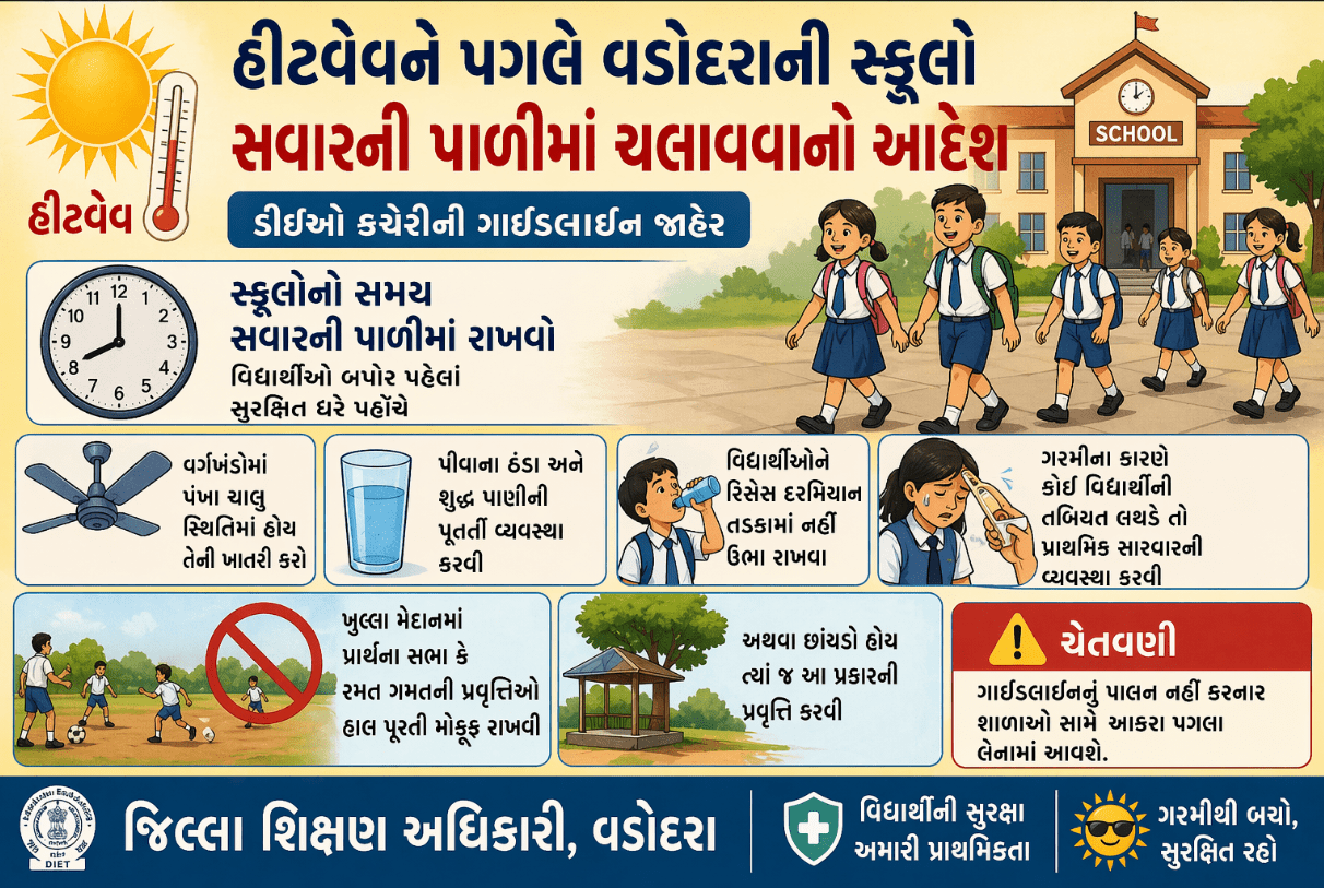 રાજ્યના અન્ય શહેરોની જેમ વડોદરામાં પણ હીટવેવની સ્થિતિને ધ્યાનમાં રાખીને જિલ્લા શિક્ષણ અધિકારી (ડીઈઓ) કચેરી દ્વારા તમામ સ્કૂલોને સવારની પાળીમાં ચલાવવાનો આદેશ આપવામાં આવ્યો છે. ખાસ કરીને સીબીએસઈ સહિતની વિવિધ શાળાઓને વિદ્યાર્થીઓની સુરક્ષા ધ્યાનમાં રાખીને સમયપત્રકમાં ફેરફાર કરવા સૂચના આપવામાં આવી છે.