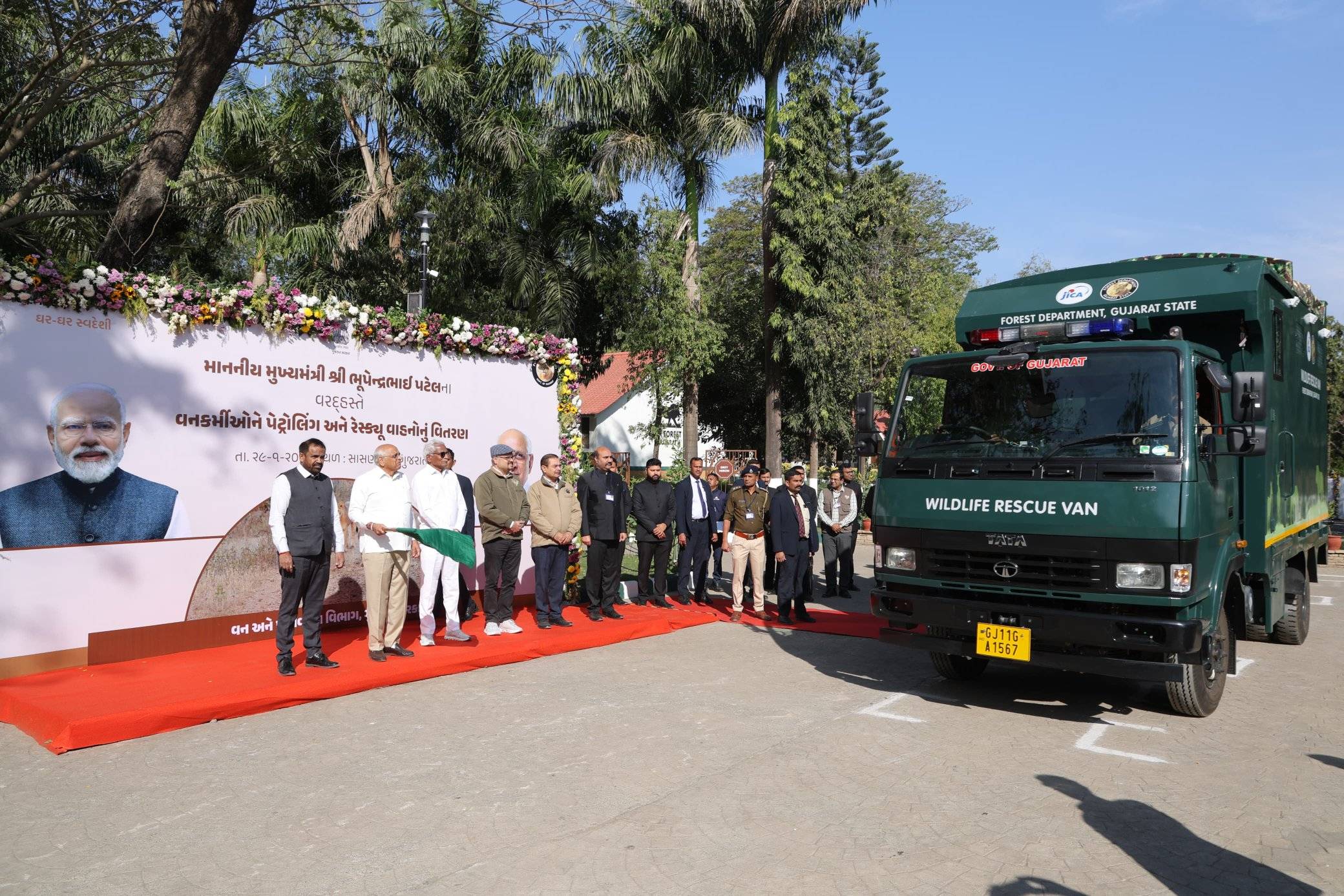 ગીર પ્રવાસ દરમિયાન મુખ્યમંત્રીએ વનકર્મીઓની કામગીરી વધુ સક્ષમ બનાવવા માટે ખાસ સુવિધાથી સજ્જ 183 વાહનોને ફ્લેગ ઓફ કરાવ્યા હતા. આમાં 174 ફિલ્ડ બાઈક, 6 બોલેરો કેમ્પર અને 3 મોડિફાઇડ રેસ્ક્યૂ વાહનોનો સમાવેશ થાય છે, જે પેટ્રોલિંગ, સુરક્ષા અને રેસ્ક્યૂ કામગીરીમાં ઉપયોગી બનશે. આ અવસરે વન પર્યાવરણ અગ્ર સચિવ ડૉ. વિનોદ રાવ, અગ્રમુખ્ય વન સંરક્ષક ડૉ. જયપાલસિંહ સહિત વન વિભાગના વરિષ્ઠ અધિકારીઓ ઉપસ્થિત રહ્યા હતા. મુખ્યમંત્રીએ વન વિભાગના રેસ્ક્યૂ સેન્ટરની પણ મુલાકાત લીધી હતી.ત્યારબાદ સીએમ ભુપેન્દ્ર પટેલે દ્વારકા ખાતે ભગવાન દ્વારકાધીશના ચરણોમાં શીશ ઝૂકાવી દર્શન કર્યા હતા. શાસ્ત્રોક્ત વિધિપૂર્વક પાદુકાપૂજન કરી તેમણે રાજ્યના નાગરિકોની સુખ, શાંતિ અને સમૃદ્ધિ માટે પ્રાર્થના કરી હતી. મંદિર પરિસરમાં ઉપસ્થિત દર્શનાર્થીઓને અભિવાદન આપીને “જય દ્વારકાધીશ” પાઠવ્યા હતા.