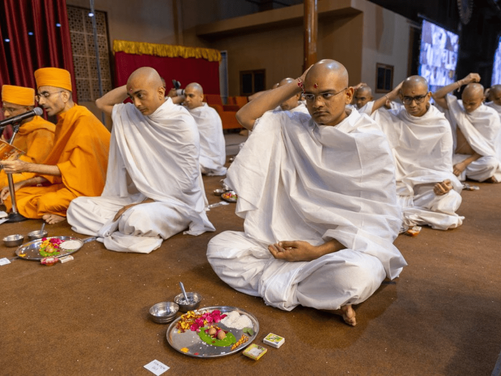 દીક્ષા મહોત્સવનો પ્રારંભ વહેલી સવારે ૬ વાગ્યે વૈદિક મહાપૂજા વિધિથી થયો હતો. દીક્ષા સમારોહ અંતર્ગત વરિષ્ઠ સંતોએ નવદીક્ષિતોને કંઠી, ઉપવસ્ત્ર અને પાઘ ધારણ કરાવી હતી તેમજ ભાલ અને બંને હાથે ચંદનની અર્ચા કરી હતી. ત્યારબાદ, મહંત સ્વામી મહારાજે નવદીક્ષિત સંતોને ‘અક્ષરમ્ અહં પુરુષોત્તમ દાસોસ્મિ’ (અર્થાત્: હું અક્ષર છું અને પુરુષોત્તમનો દાસ છું)નો ગુરુમંત્ર આપી આશીર્વાદ પાઠવ્યા હતા.