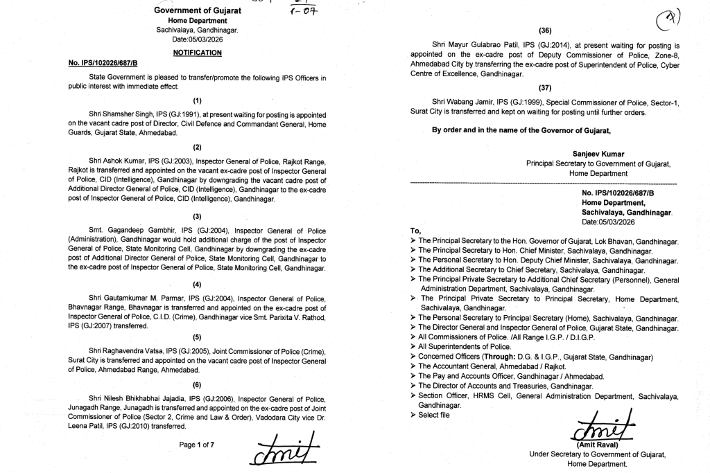 ગુજરાત IPS અધિકારીઓની બદલીની મુખ્ય વિગતો