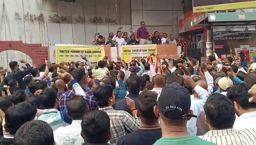 બેંક કર્મચારી યુનિયનોએ 5 વર્કિંગ ડેની માંગ કરી લાંબા સમયથી પડતર માંગણીનો નિવેડો આવે તે માટે 27 જાન્યુઆરીએ દેશવ્યાપી હડતાળની જાહેરાત કરી હતી. આ હડતાળનું આહ્વાન યુનાઇટેડ ફોરમ ઓફ બેન્ક યુનિયન દ્વારા કરવામાં આવ્યું છે. ત્યારે, વડોદરા શહેરમાં પણ આરાધના સિનેમાની સામે આવેલી બીઓબીની બહાર કર્મચારીઓ એકત્ર થઈ આ હડતાલમાં જોડાયા હતા અને સુત્રોચાર સાથે વિરોધ પ્રદર્શન કર્યું હતું.