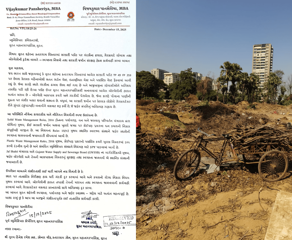 સુરતઃ શહેરના કતારગામ વિસ્તારમાં આવેલા સરકારી પ્લોટ TP 49 FP 359 પર છેલ્લા કેટલાક મહિનાઓથી સતત ગાર્ડન વેસ્ટ, ઇન્ડસ્ટ્રીયલ વેસ્ટ અને પ્લાસ્ટિક વેસ્ટ ફેંકવામાં આવી રહ્યું છે. જેના કારણે સ્થળે ગંદકીના ઢગલા ઊભા થઈ ગયા છે અને આજુબાજુના રહેવાસીઓને અતિશય તકલીફ પડી રહી છે.