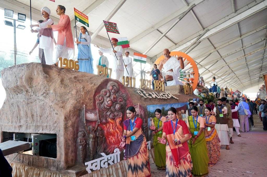 ટેબ્લોના અંતિમ ભાગમાં ‘ચરખા’ દ્વારા સ્વદેશી અને સ્વતંત્રતાનો સંદેશ આપનારા મહાત્મા ગાંધીનું શિલ્પ અને વિશાળ અશોક ચક્ર રજૂ કરવામાં આવ્યું છે, જે આજના ‘આત્મનિર્ભર ભારત’ અભિયાન સાથેનો સશક્ત સંદેશ આપે છે. ગુજરાતી સાહિત્યના રાષ્ટ્રીય શાયર ઝવેરચંદ મેઘાણી રચિત ‘કસુંબીનો રંગ’ના તાલે કલાકારોની પ્રસ્તુતિ ઝાંખીમાં રાષ્ટ્રીય જુસ્સો ઉમેરે છે.