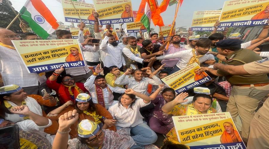 આમ આદમી પાર્ટીએ આ ઘટનાનો સખત શબ્દોમાં વિરોધ કરતા સ્પષ્ટ ચેતવણી આપી હતી કે જ્યાં સુધી ભાજપના નેતાઓ જગદ્ગુરુ શંકરાચાર્ય મહારાજ અને સંતો પાસે જાહેરમાં માફી નહીં માંગે ત્યાં સુધી આ લડાઈ ચાલુ રાખવામાં આવશે. વિરોધ પ્રદર્શન દરમિયાન પોલીસે આમ આદમી પાર્ટીના નેતાઓ અને કાર્યકર્તાઓની ટીંગાટોળી કરી અટકાયત કરી હતી.