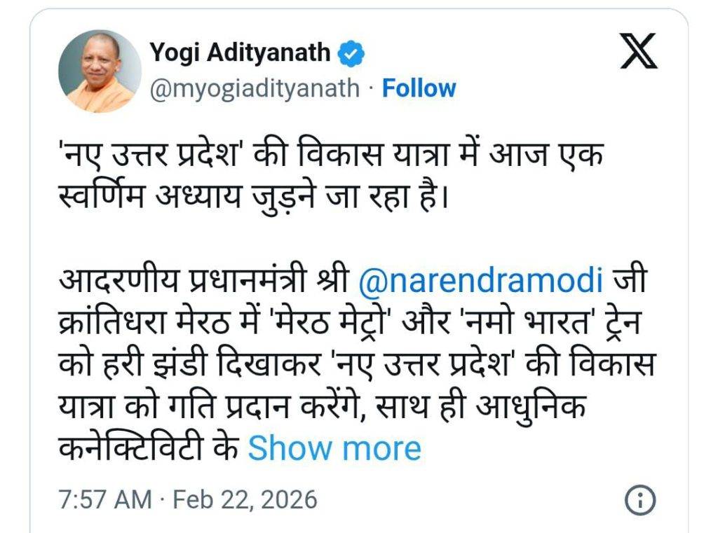 ઉત્તર પ્રદેશના વિકાસમાં આજે એક મહત્વપૂર્ણ ક્ષણ ઉમેરાવાની છે. ભારતના પ્રધાનમંત્રી Narendra Modi Meerutમાં મેરઠ મેટ્રો સેવા અને હાઈ-સ્પીડ ‘નમો ભારત’ ટ્રેનને લીલી ઝંડી આપશે. આ સાથે જ લગભગ ₹12,930 કરોડના વિવિધ વિકાસ પ્રોજેક્ટ્સનું ઉદ્ઘાટન અને શિલાન્યાસ પણ કરવામાં આવશે. કાર્યક્રમ બાદ પ્રધાનમંત્રી મોહીદ્દીનપુર ખાતે યોજાનારી વિશાળ જાહેર સભાને સંબોધિત કરશે.