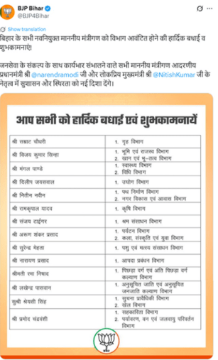 તમામ મંત્રીઓ અને તેમના વિભાગોની સૂચિ સરકાર દ્વારા સત્તાવાર રીતે જાહેર કરી દેવામાં આવી છે. રાજકીય રીતે આ ફેરફાર NDA સરકાર માટે મહત્વપૂર્ણ માનવામાં આવી રહ્યો છે અને આગલા સમયમાં બિહારના પ્રશાસનમાં મોટી અસર જોવા મળશે.