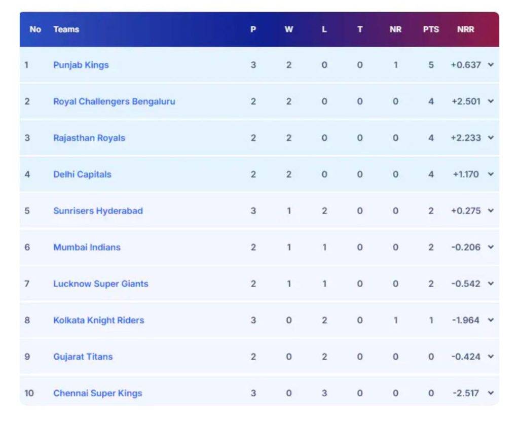પંજાબ કિંગ્સ પહોંચ્યું ટોપ પર, KKR એ ખાતું ખોલાવી ગુજરાત ટાઇટન્સને પાછળ છોડ્યું
