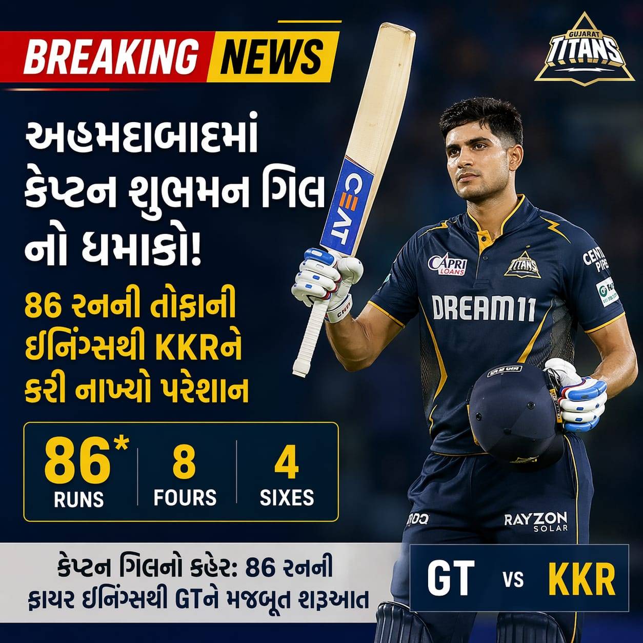IPL 2026ના મહત્વપૂર્ણ મુકાબલામાં Shubman Gill ફરી એકવાર તોફાની ફોર્મમાં જોવા મળ્યા. અમદાવાદના નરેન્દ્ર મોદી સ્ટેડિયમમાં રમાયેલા મુકાબલામાં Gujarat Titansના કેપ્ટન શુભમન ગિલે 8 ચોગ્ગા અને 4 છગ્ગાની મદદથી શાનદાર 86 રનની ઇનિંગ્સ રમીને Kolkata Knight Riders સામે ટીમને મજબૂત સ્થિતિમાં પહોંચાડી હતી. તેમની આ ઇનિંગ્સ મેચનો ટર્નિંગ પોઇન્ટ સાબિત થઈ.
