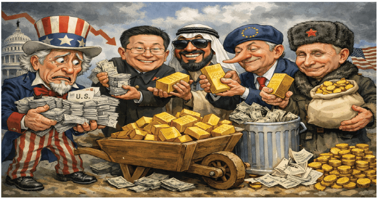 દુનિયાના દેશો અમેરિકાના ટ્રેઝરી બોન્ડ વેચીને સોનું ખરીદી રહ્યા છે, જેને કારણે અમેરિકાના ડોલરનું સામ્રાજ્ય કડડભૂસ થવાનો પ્રારંભ થઈ ગયો છે. લગભગ ત્રણ દાયકામાં પહેલી વાર વૈશ્વિક કેન્દ્રીય બેંકો દ્વારા રાખવામાં આવેલા સોનાનું કુલ મૂલ્ય અમેરિકાના ટ્રેઝરી બોન્ડમાં તેમના રોકાણ કરતાં વધી ગયું છે. સેન્ટ્રલ બેંકો પાસે સોનાનો ભંડાર લગભગ ૪ અબજ ડોલર સુધી પહોંચી ગયો છે, જ્યારે અમેરિકન ટ્રેઝરીમાં તેમનું રોકાણ ૩.૫ અબજ ડોલર છે. સોનું યુરોને પાછળ છોડીને યુએસ ડોલર પછી બીજા ક્રમનું સૌથી મોટું આંતરરાષ્ટ્રીય અનામત મૂલ્ય બન્યું છે.