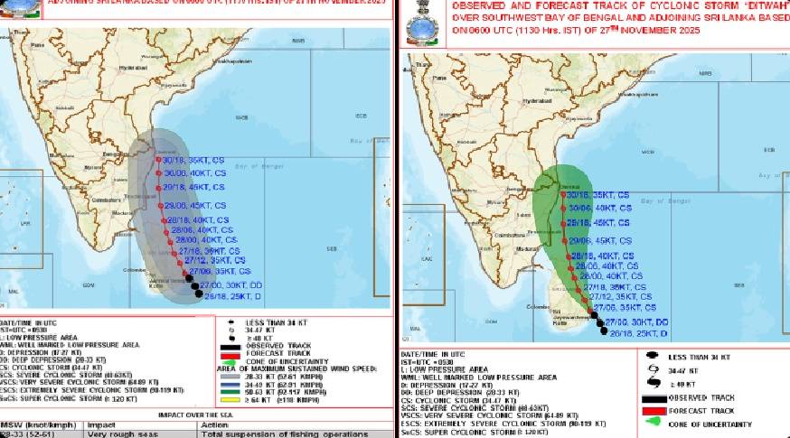 ચક્રવાત દિત્વા નજીક આવતાની સાથે ચેન્નાઈમાં IMD ના પ્રાદેશિક હવામાન કેન્દ્રે શુક્રવારે તમિલનાડુના ઘણા જિલ્લાઓ માટે ત્રણ કલાકનું યલો એલર્ટ જારી કર્યું હતું. વધુમાં પુડુચેરી અને દક્ષિણ આંધ્રપ્રદેશના ઘણા જિલ્લાઓમાં ભારે વરસાદ અને વાવાઝોડાની ચેતવણી જારી કરવામાં આવી છે.